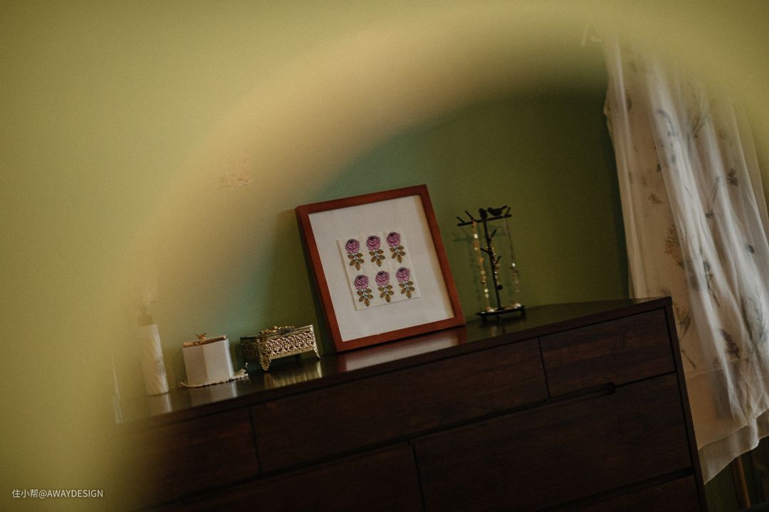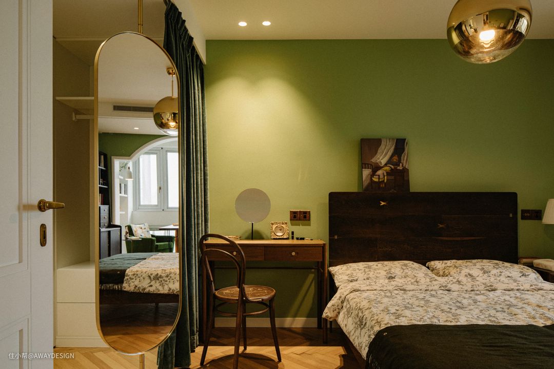 进入主卧正对的是梳妆台。墨绿的帷幔,浅绿的墙面,深棕的桌椅。