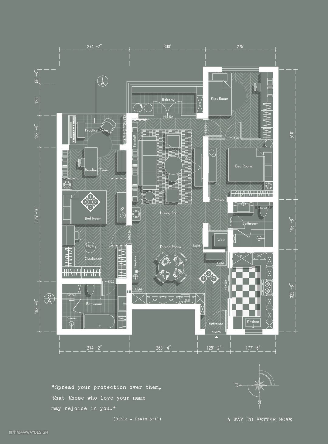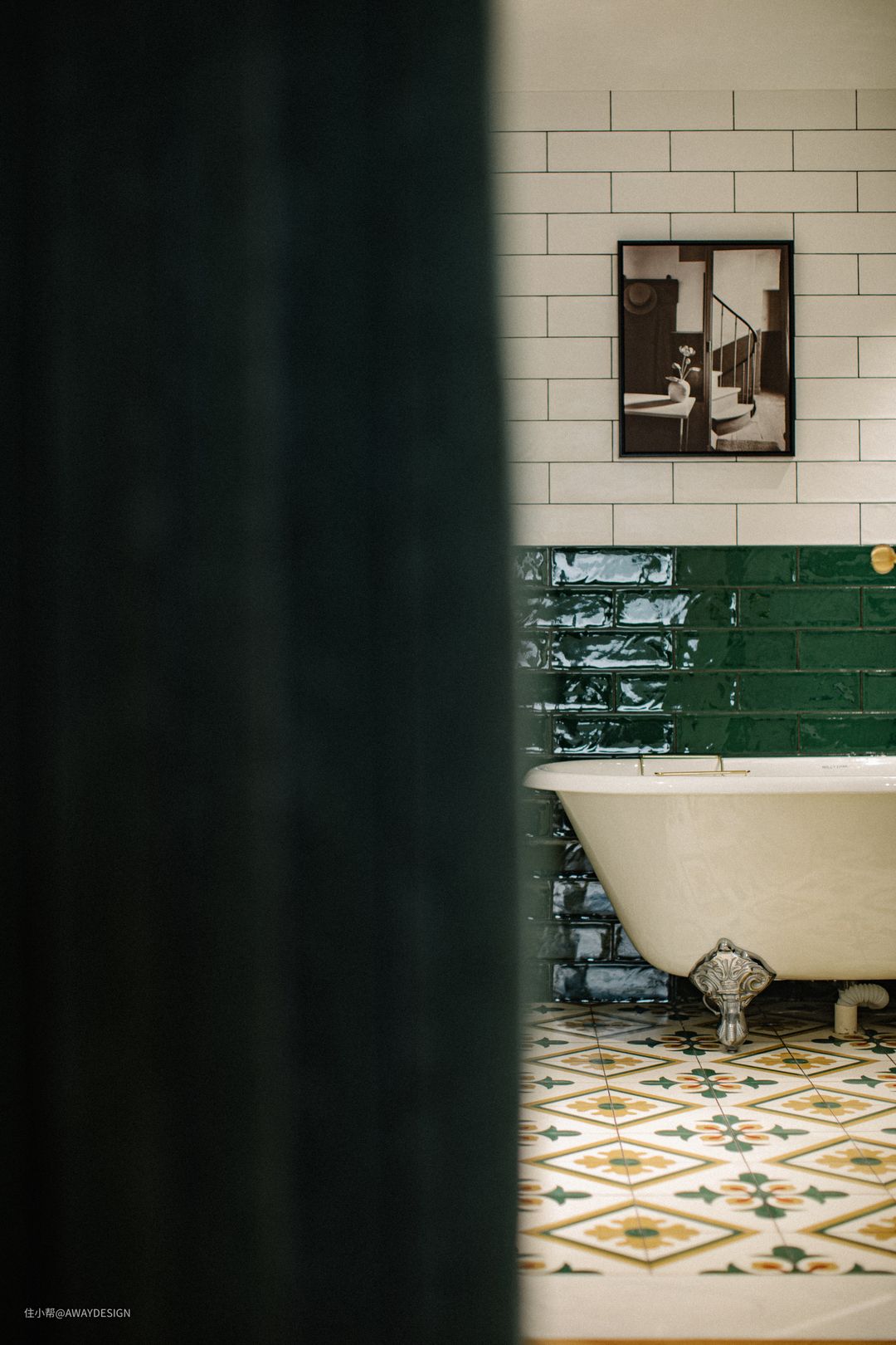 主卫可经衣帽间进入,延续了主卧的墨绿色,地面铺设植物主题花砖,与墙面的绿/白色方砖相呼应。洗漱、浴缸、马桶、淋浴,收纳共同组成了“完美”主卫。
