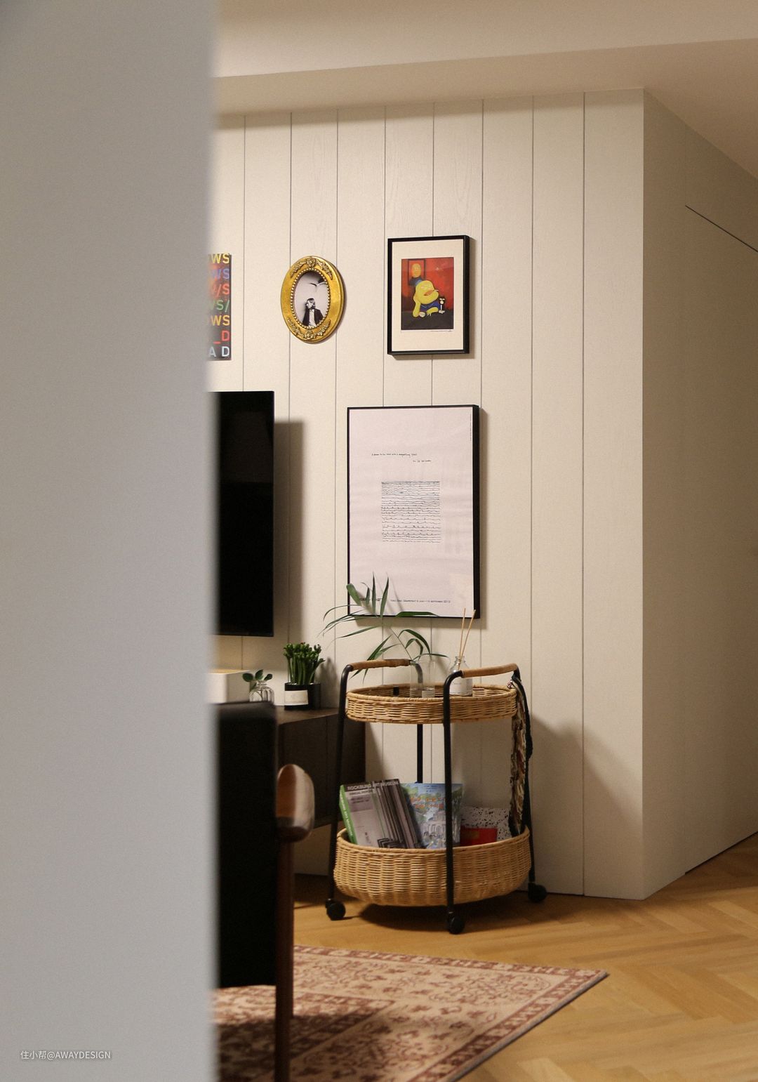 餐厅望向客厅。右侧的电视背景墙和次卧房入口墙体都做了木制护墙。