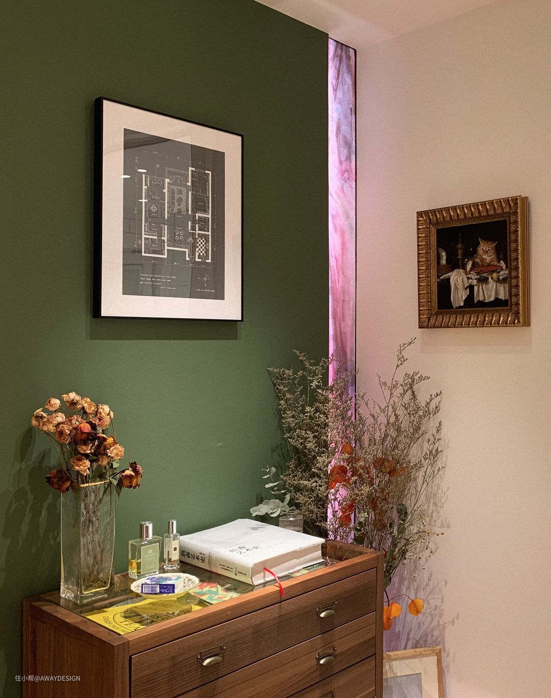 玄关绿色背景墙与厨房白色墙面之间断开,设置了内含灯带的彩色玻璃,强调背景墙的独立性和体量感。左侧挂画是艺术化处理后的设计平面图,作为进门的对景;右侧为业主精选的油画《用餐中的猫》,与餐厅进行趣味互动。