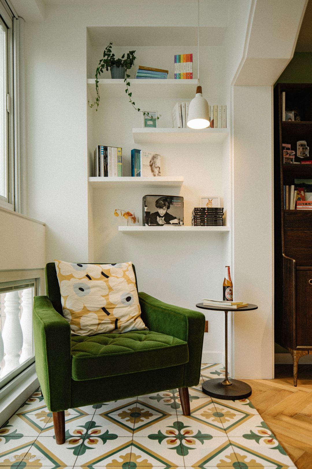 阳台休闲区,设计了交错的置物架,一侧的吊灯可以在晚上为阅读提供灯光。地面铺设了客厅阳台同款水泥花砖,花砖和木地板之间采用密拼的工艺。