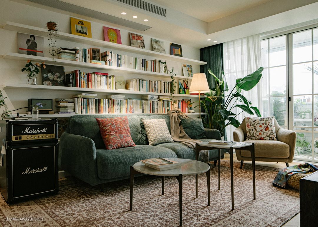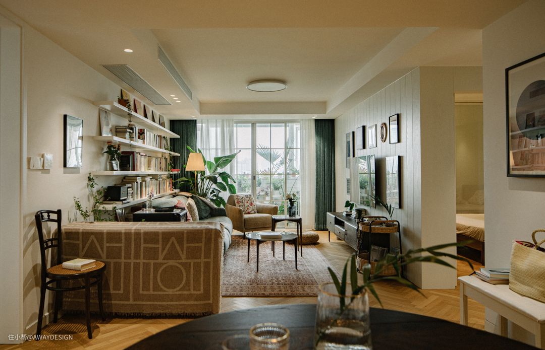 业主 Arelia 从事文化艺术相关的文字工作,2018年底找到我们时,她正在看房子。虽然这套房子的户型布局并不是特别理想,但地段和周边人文环境出众。房子短期内一个人居住,同时要考虑客房和多功能房的设置;公共区的客餐厅,业主会邀请一些朋友聚餐或看电影;主卧是业主常待的空间,除了配套的卫生间、衣帽间、梳妆台外,还需要写作、阅读和休闲的空间;风格上,业主喜欢复古文艺的空间氛围,同时热爱与月亮有关的意象。我们不希望去模仿传统的美式或法式风格,堆砌线脚浮雕造型,因此在设计语言中尽量保持克制。硬装部分延续了相对现代的风格,而在各空间中主要通过色彩和活动家具及软装饰品来营造复古特质。