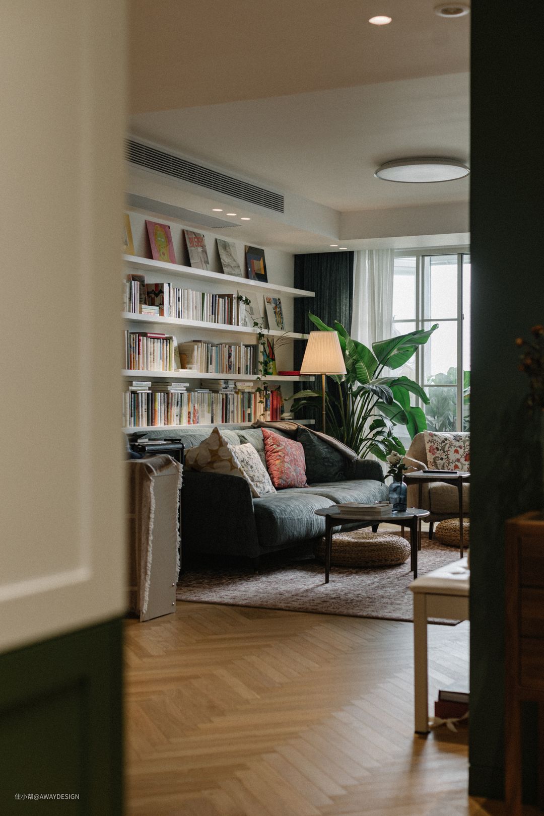 从玄关望向客厅,以层层书架作为客厅的主背景。