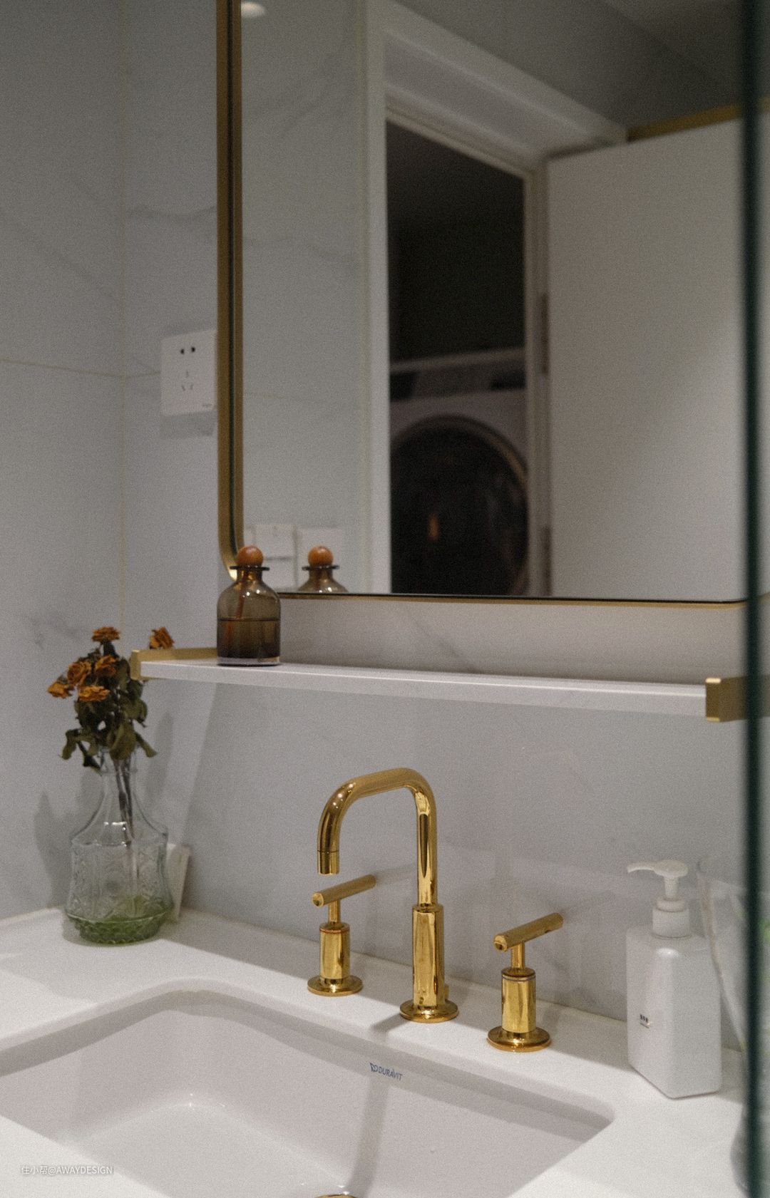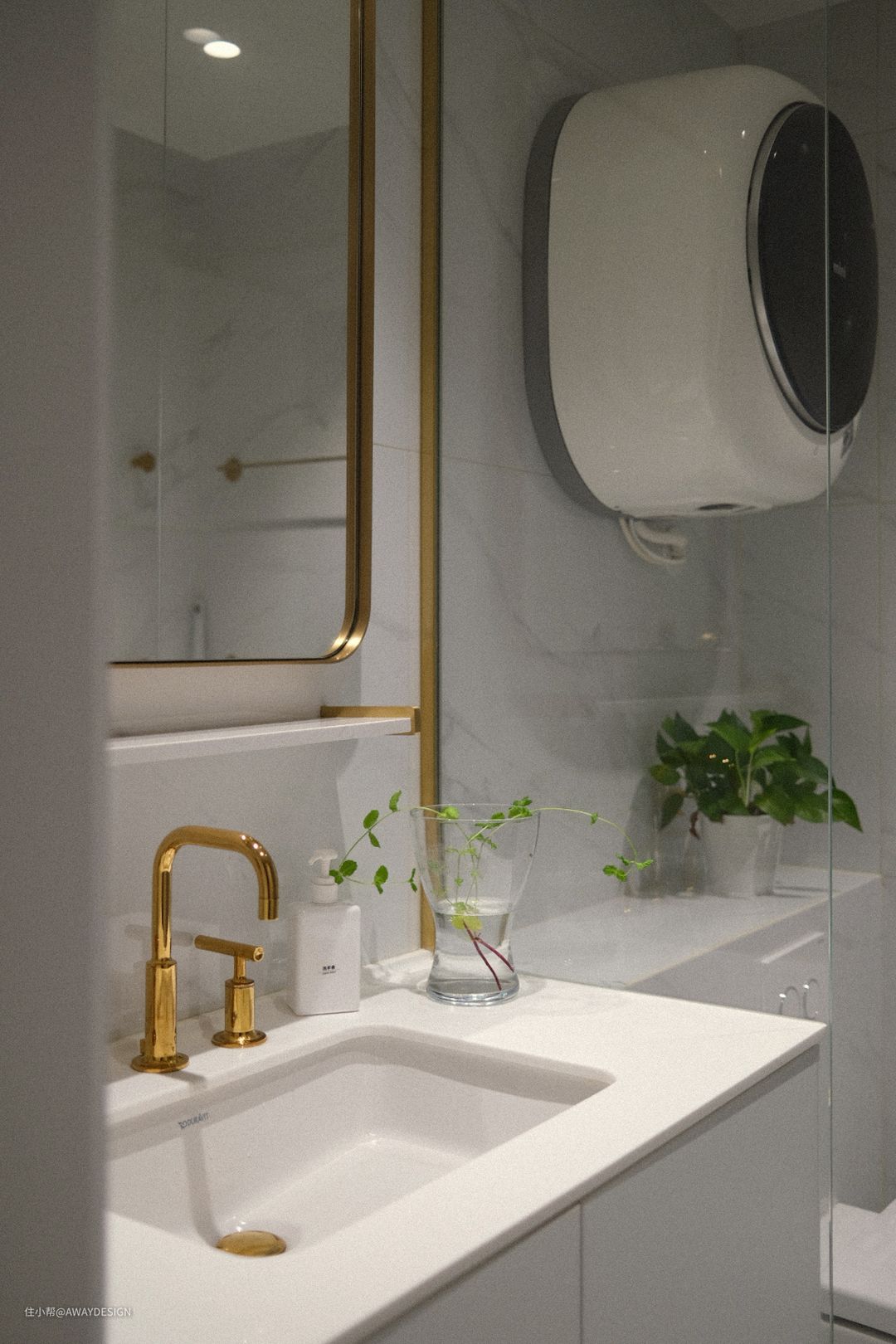 次卫空间不大,为避免出现拥挤感,整个空间以白色大理石为底色,搭配黄铜五金,简洁又富有细节。