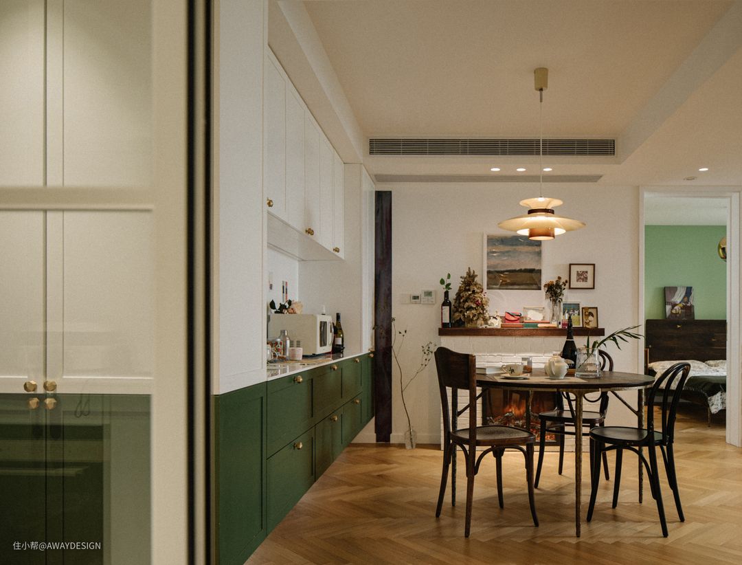 回望玄关,墙面和柜子的墨绿相呼应。右侧的西厨柜跟玄关柜连为一体,底部悬空并设置了灯带,让空间更加开敞。