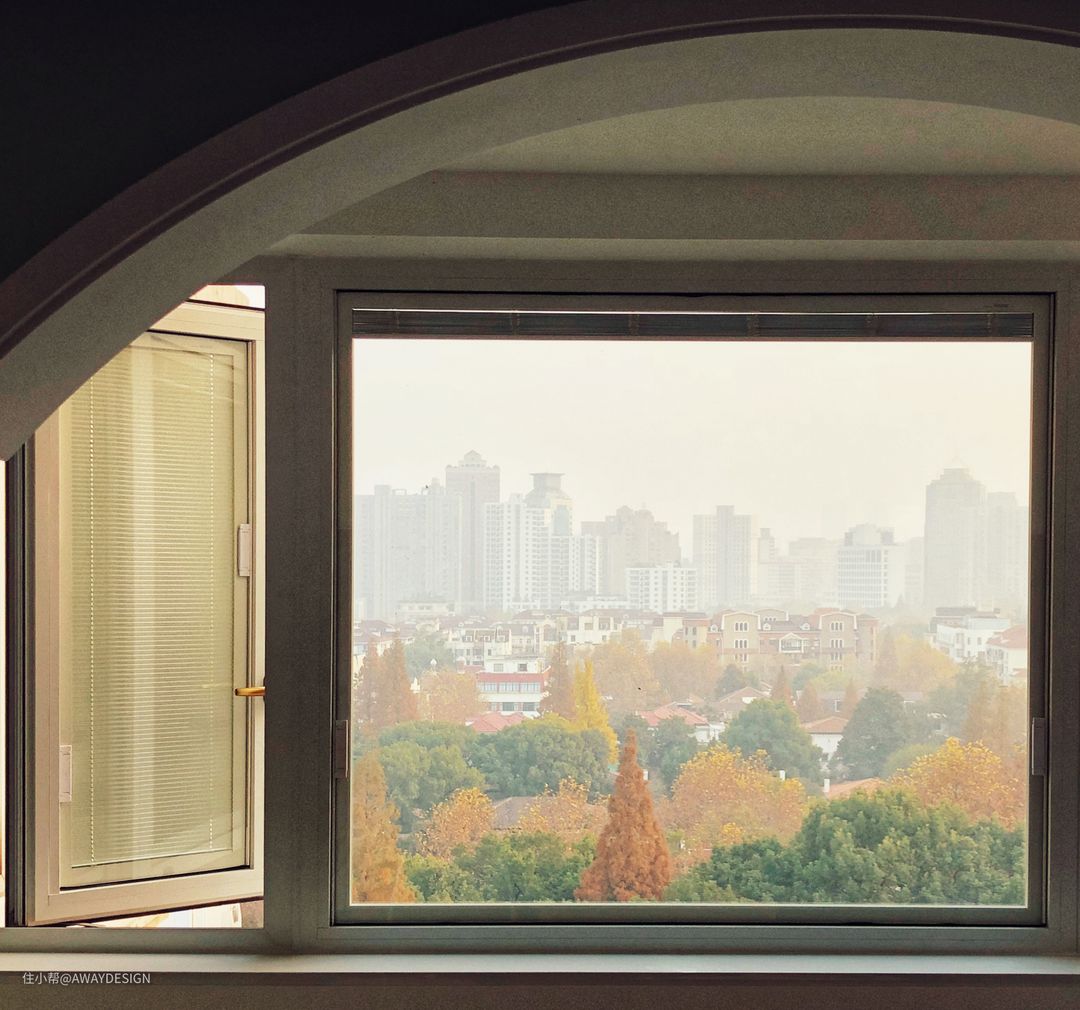阳台的窗户中间设计了固定扇,两边可以开启通风。中间的固定扇可成为窗外风景的画框。