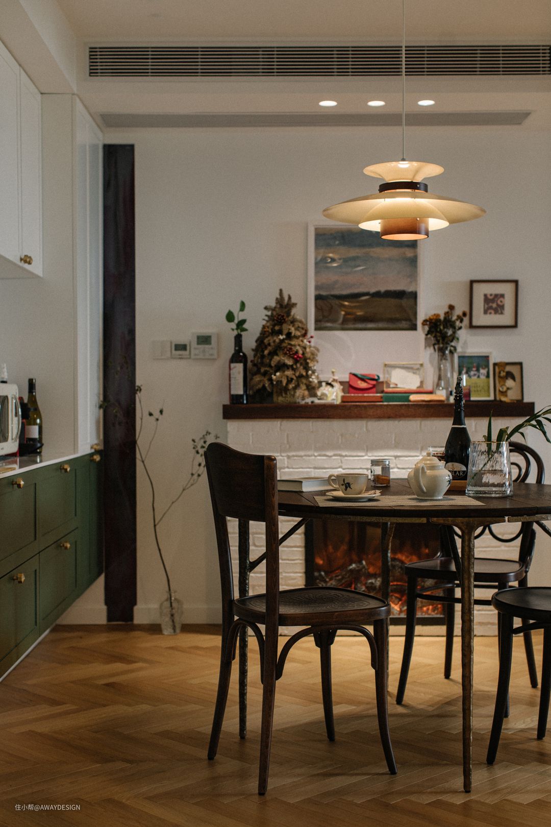 壁炉现场 DIY,用红砖砌筑后,刷上白色乳胶漆,顶部用定制的胡桃木盖板覆盖,颜色与餐桌同色系。