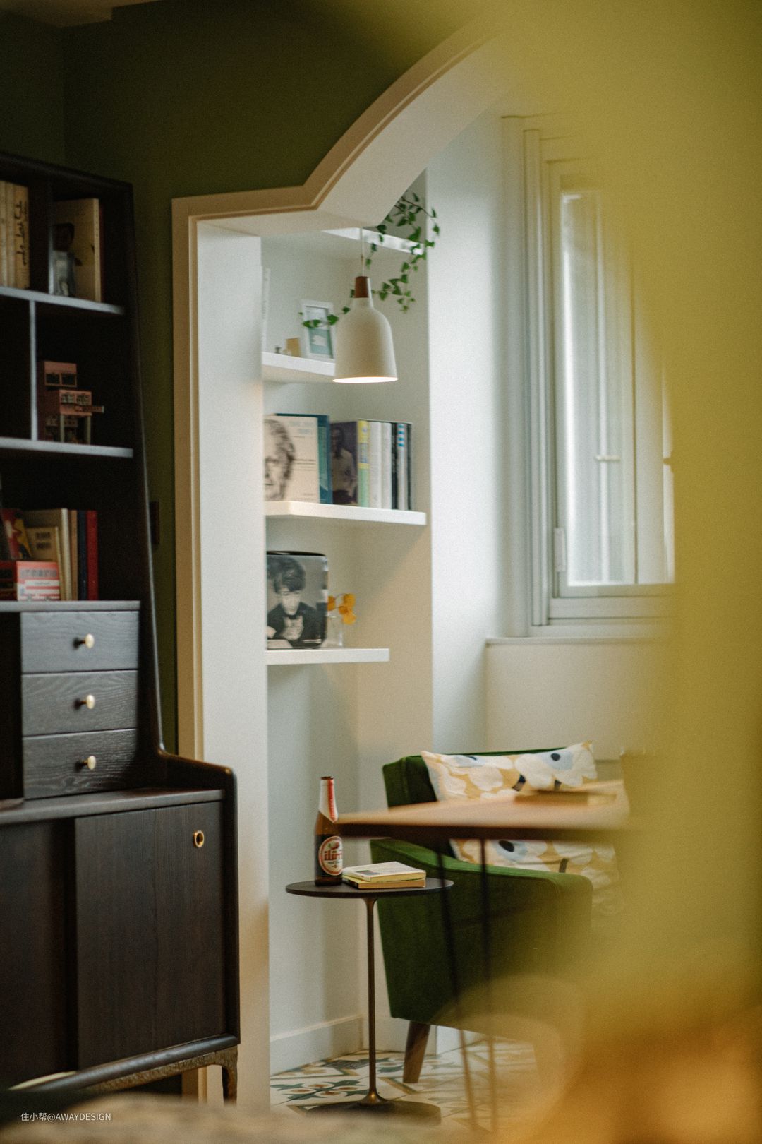 休息区和工作区之间通过纱帘进行弱分隔,工作区与内阳台则通过拱门进行区分,各分区之间虽然相通,但都有各自隐性的边界。(阳台的墨绿墙面与玄关墙面颜色保持一致,突出整体性)