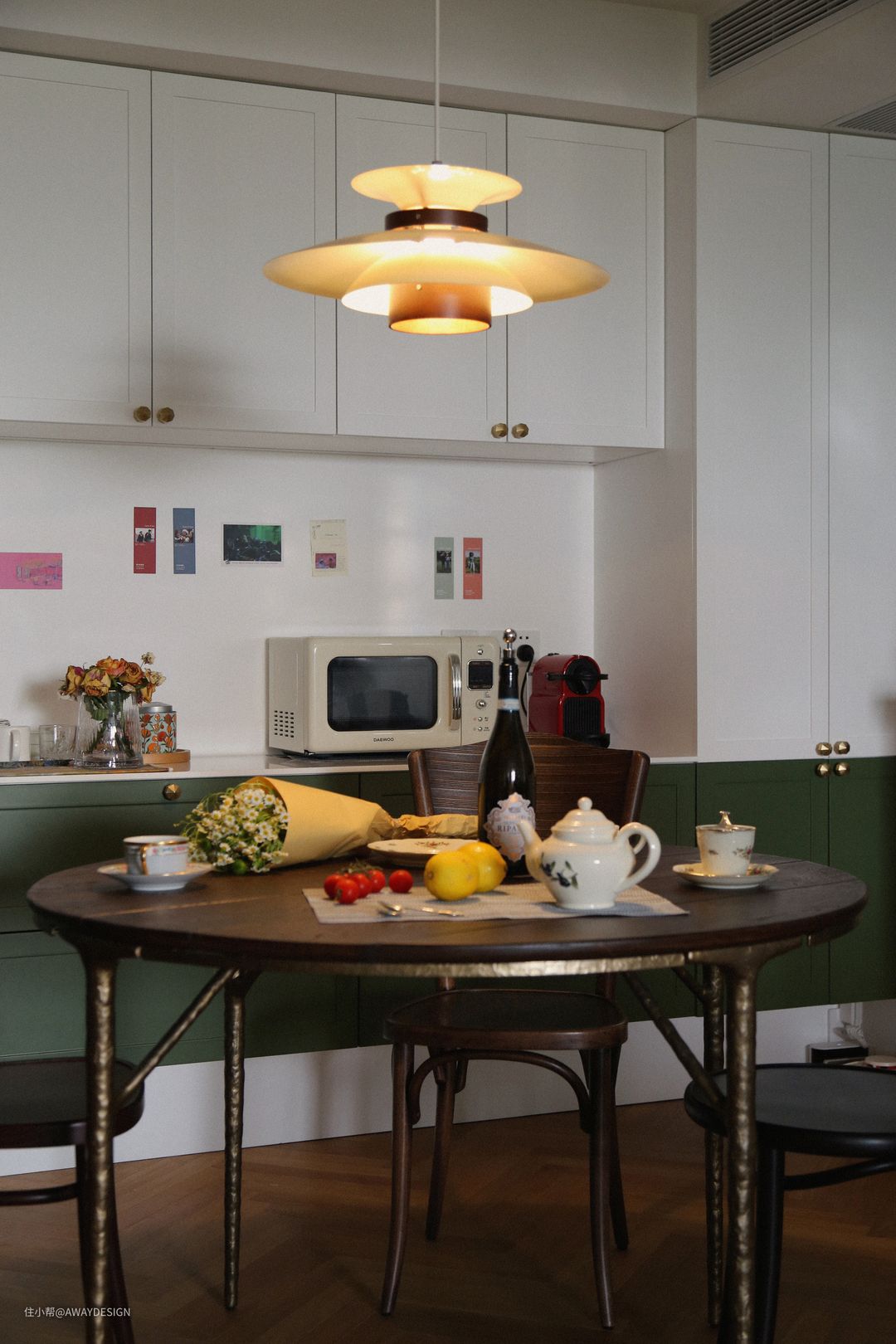 从餐厅回望厨房和玄关,餐厨之间视线相互连通。这里可以看到“用餐猫”画作与餐桌的互动关系。