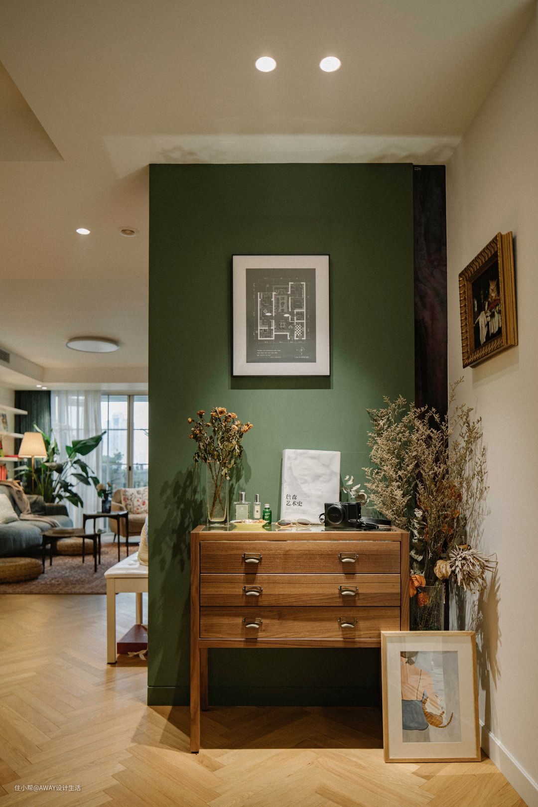玄关空间除满足收纳功能外,也希望营造出归来的愉悦感。推开门,灯光亮起的那一刻,映入眼前的是整面绿色的对景墙,花束、装饰画、柔和灯光迎接主人步入自己的小小王国。