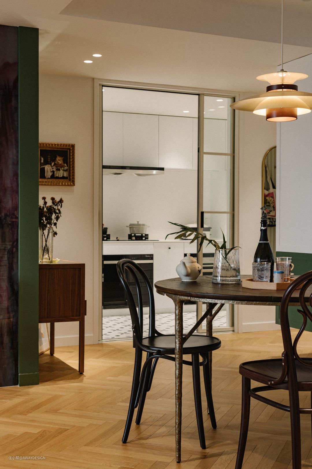 玄关绿色背景墙与厨房白色墙面之间断开,设置了内含灯带的彩色玻璃,强调背景墙的独立性和体量感。左侧挂画是艺术化处理后的设计平面图,作为进门的对景;右侧为业主精选的油画《用餐中的猫》,与餐厅进行趣味互动。
