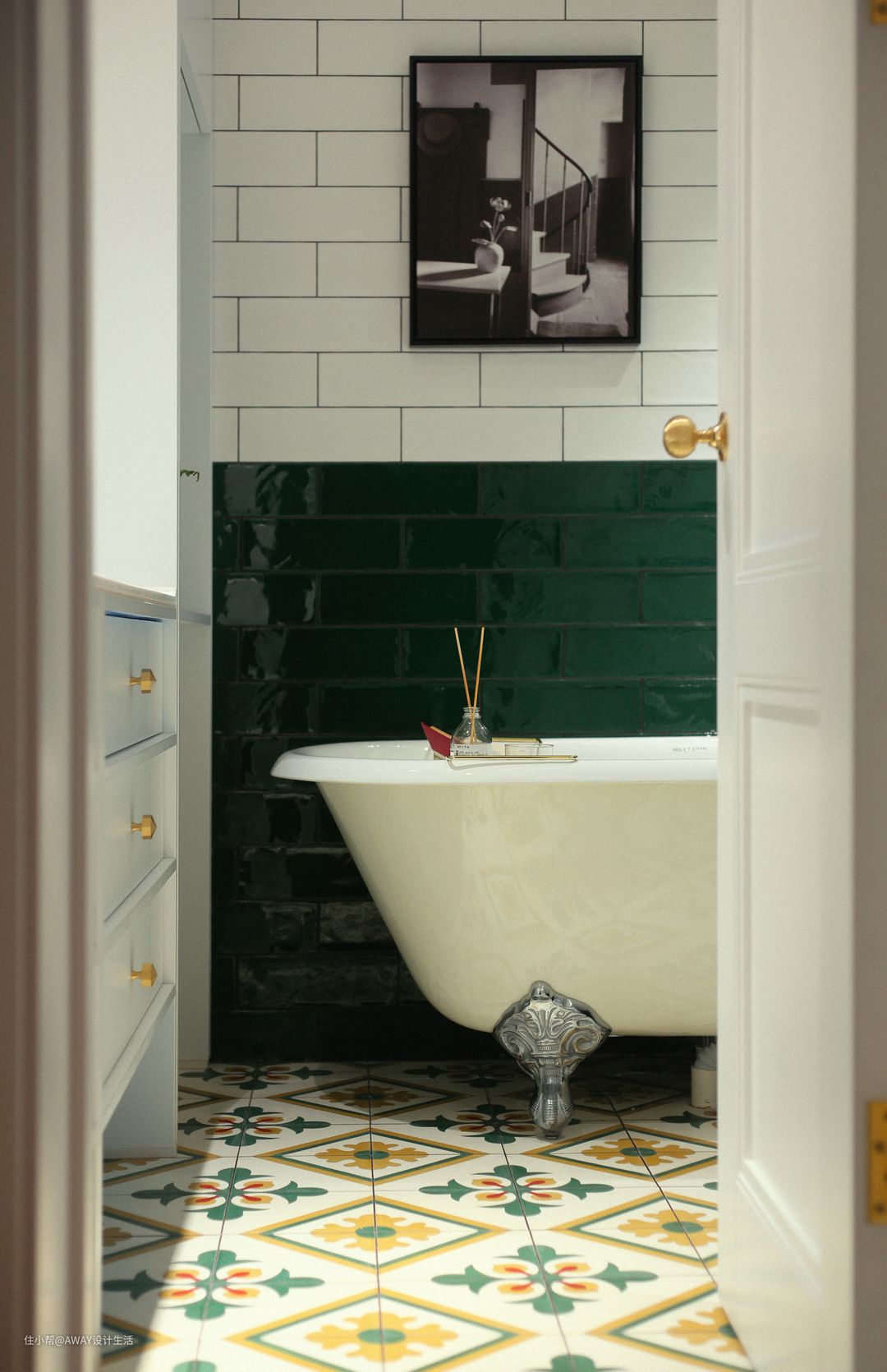 主卫可经衣帽间进入,延续了主卧的墨绿色,地面铺设植物主题花砖,与墙面的绿/白色方砖相呼应。洗漱、浴缸、马桶、淋浴,收纳共同组成了“完美”主卫。