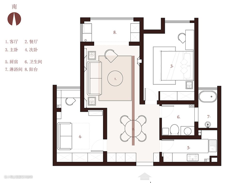 业主是一对年轻的夫妻,他们希望家是简单轻松的,有中式的氛围,但要求不俗套不套路化。一般理解的中式或东方风格往往会运用木屏风、字画、瓷器、纸灯、深色木制家具,偏厚重。结合业主年龄,以及房屋结构和面积,设计师选择了去明显符号,点到即可。任何风格都有元素符号的运用,我们应了解学习,才能更好的去运用或去回避。 对于业主的需求,设计师没有完全直白的使用中式元素,而是以贝聿铭大师设计的苏州博物馆为灵感,借鉴其建筑和内装设计手法,运用108根定制框线和大量留白,打造出克制且自由的中式空间,软装的甄选上也克制地选用部分中式元素,从色彩到造型都点到为止,尽量去装饰化,做到少即是多。