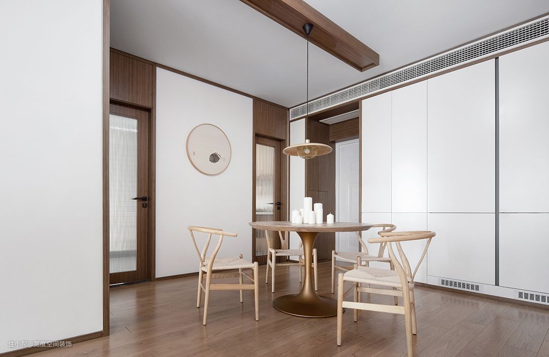 餐厅温润原木色泽在灰阶基调中脱颖而出,达到聚焦视线用途,同时平衡空间冷暖色调,迎来自然温暖气息。