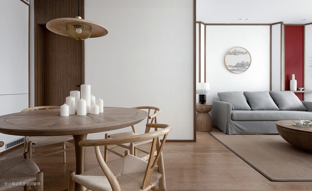 餐厅温润原木色泽在灰阶基调中脱颖而出,达到聚焦视线用途,同时平衡空间冷暖色调,迎来自然温暖气息。