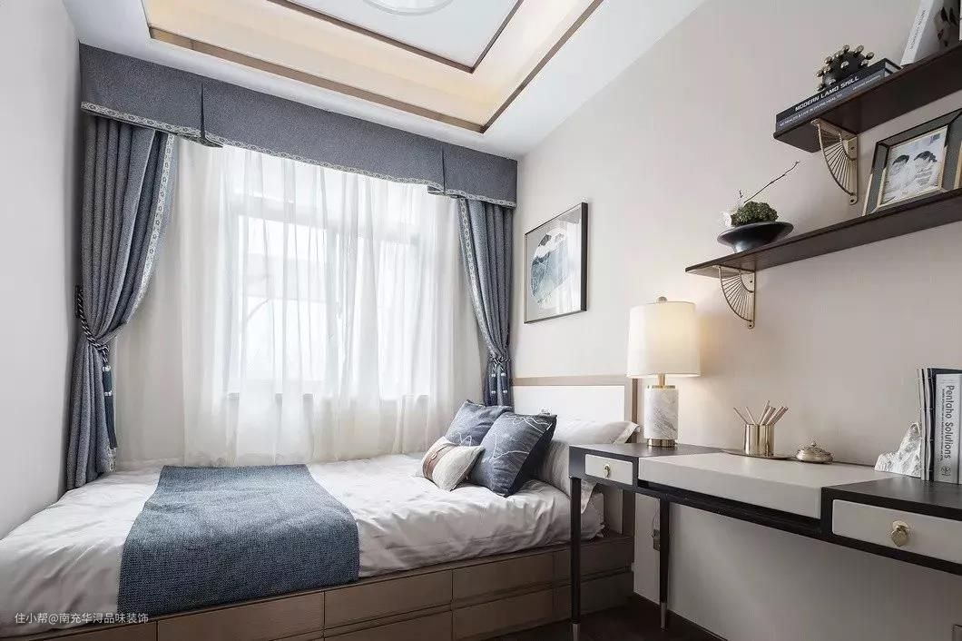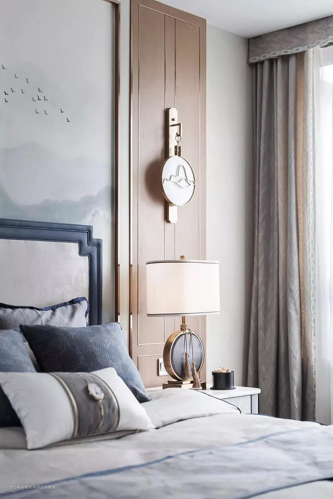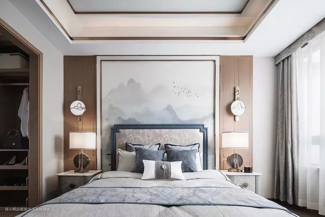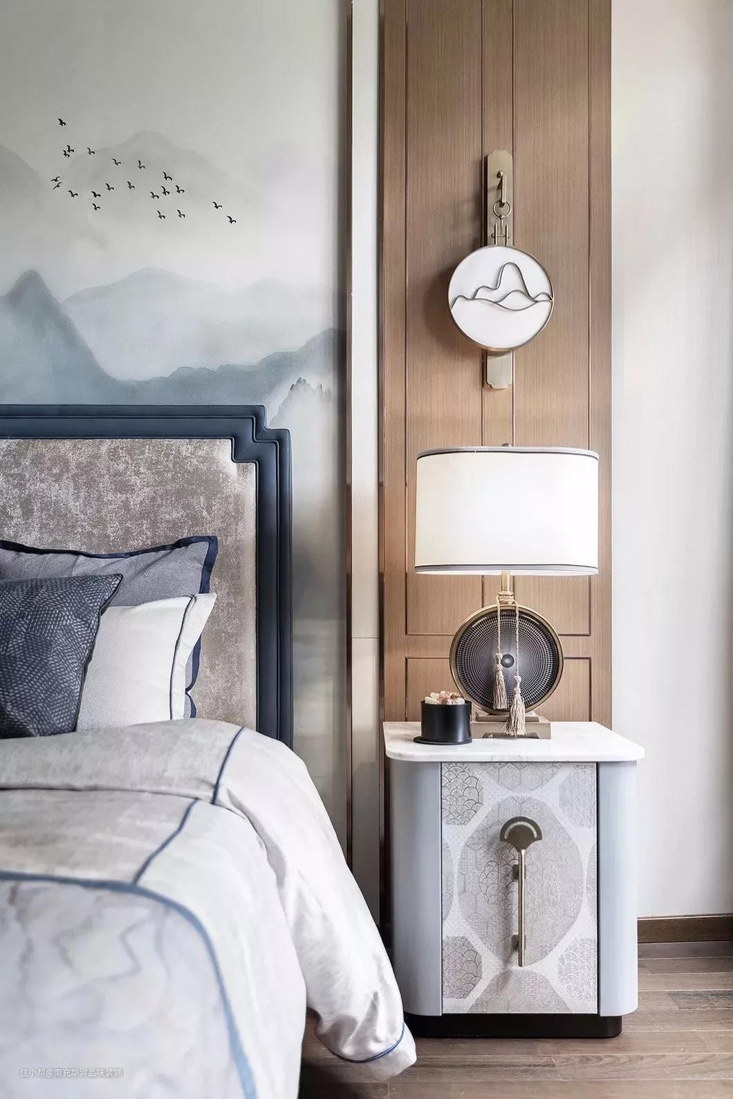 次卧的设计中,色彩的运用清幽淡雅,沉静的灰蓝调和趋近自然的木色是空间的主调,丝质与棉麻床品深具质感,水墨背景造型、瓷器台灯、花卉等各类小品摆设其中,相映成趣,空间气质盈盈。