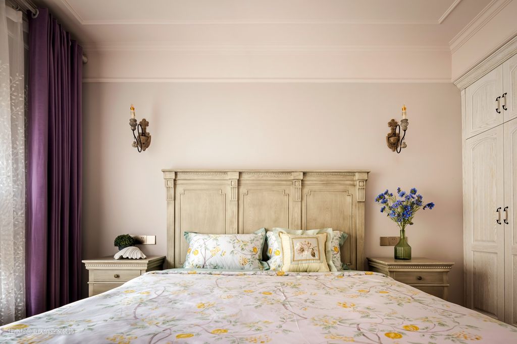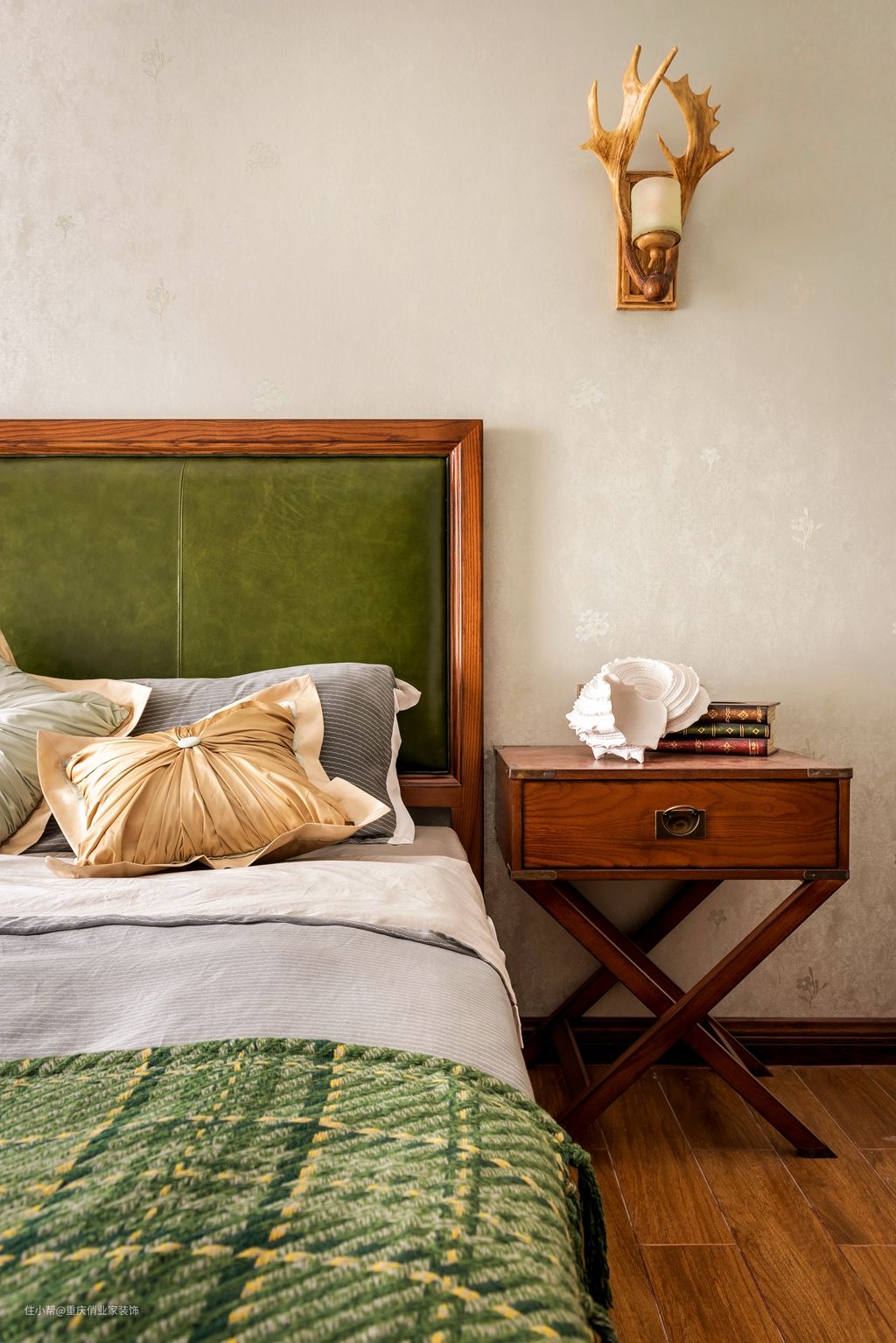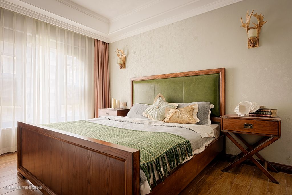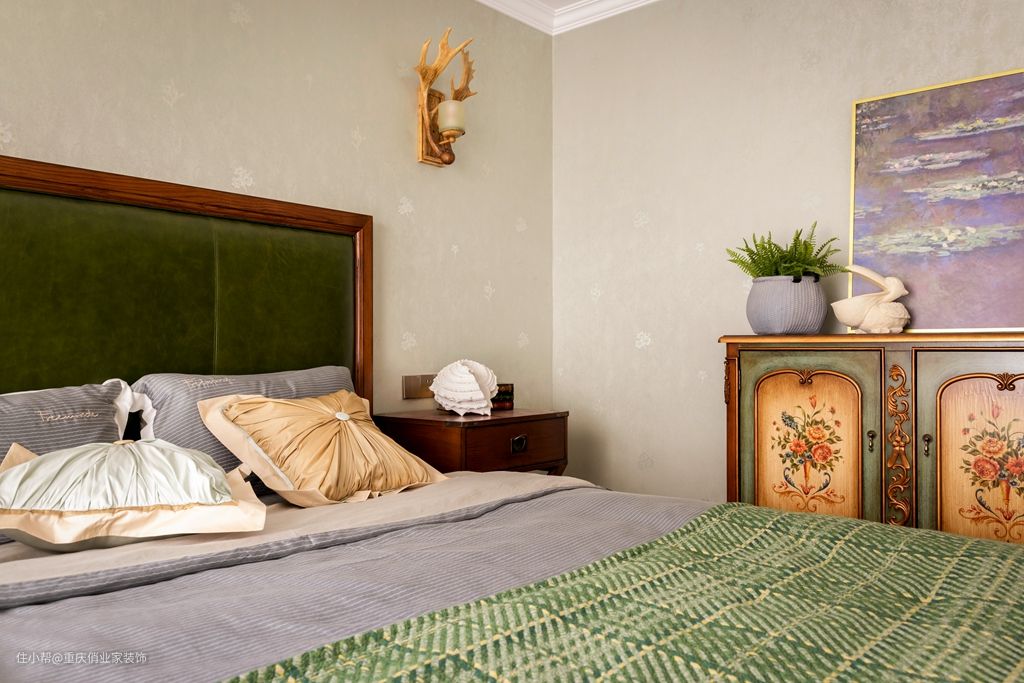 主卧在拥有独立衣帽间后,卧室的休息区域仅仅只需要满足休息和颜值两个维度,因此家具陈设简单清爽,还选用了业主最爱的复古绿系家具,搭配浅色墙布, 柔和而有质感。