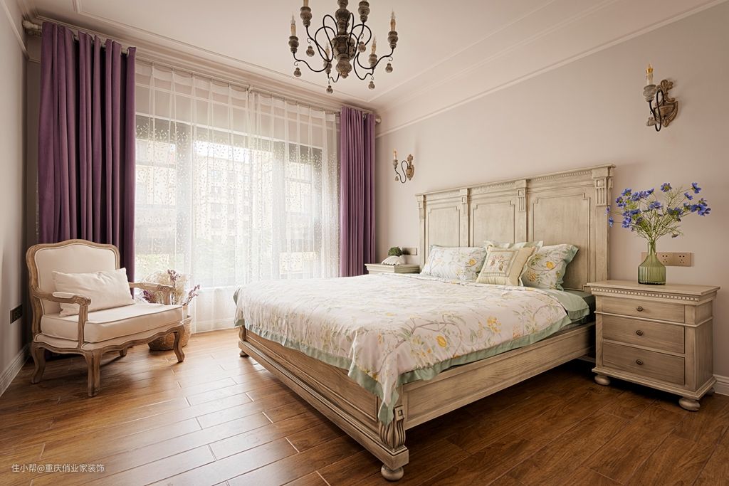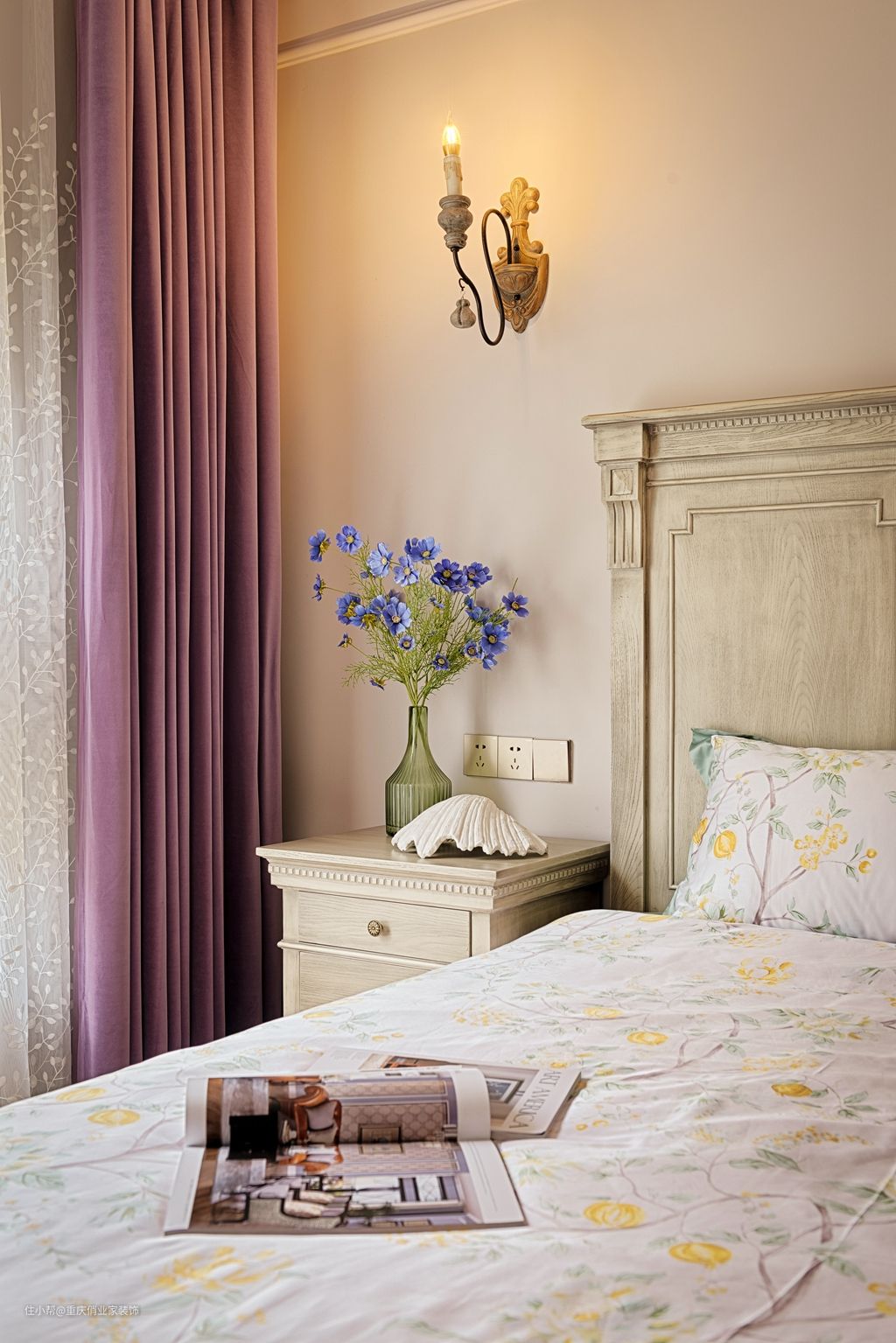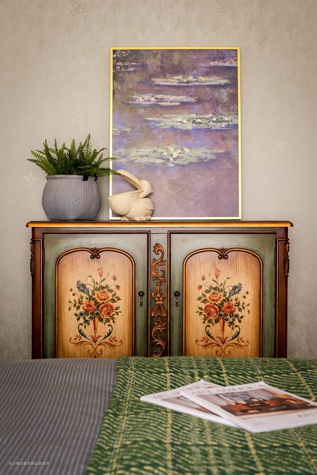 主卧在拥有独立衣帽间后,卧室的休息区域仅仅只需要满足休息和颜值两个维度,因此家具陈设简单清爽,还选用了业主最爱的复古绿系家具,搭配浅色墙布, 柔和而有质感。