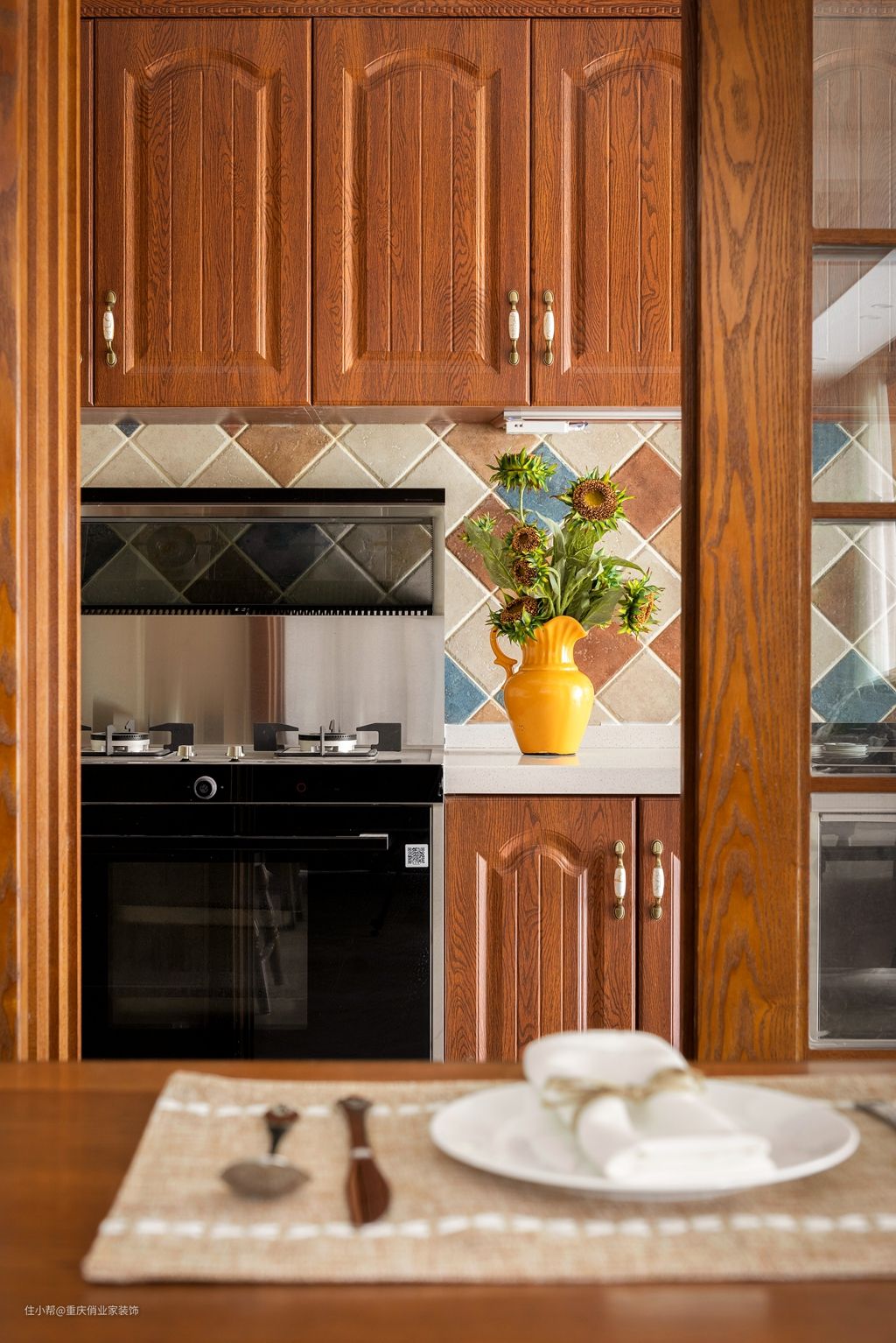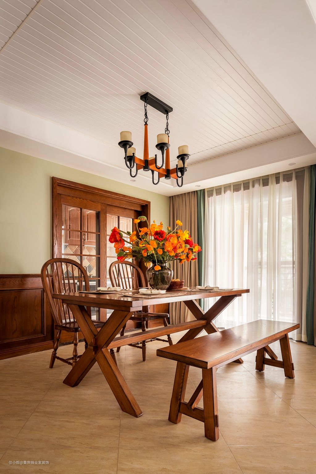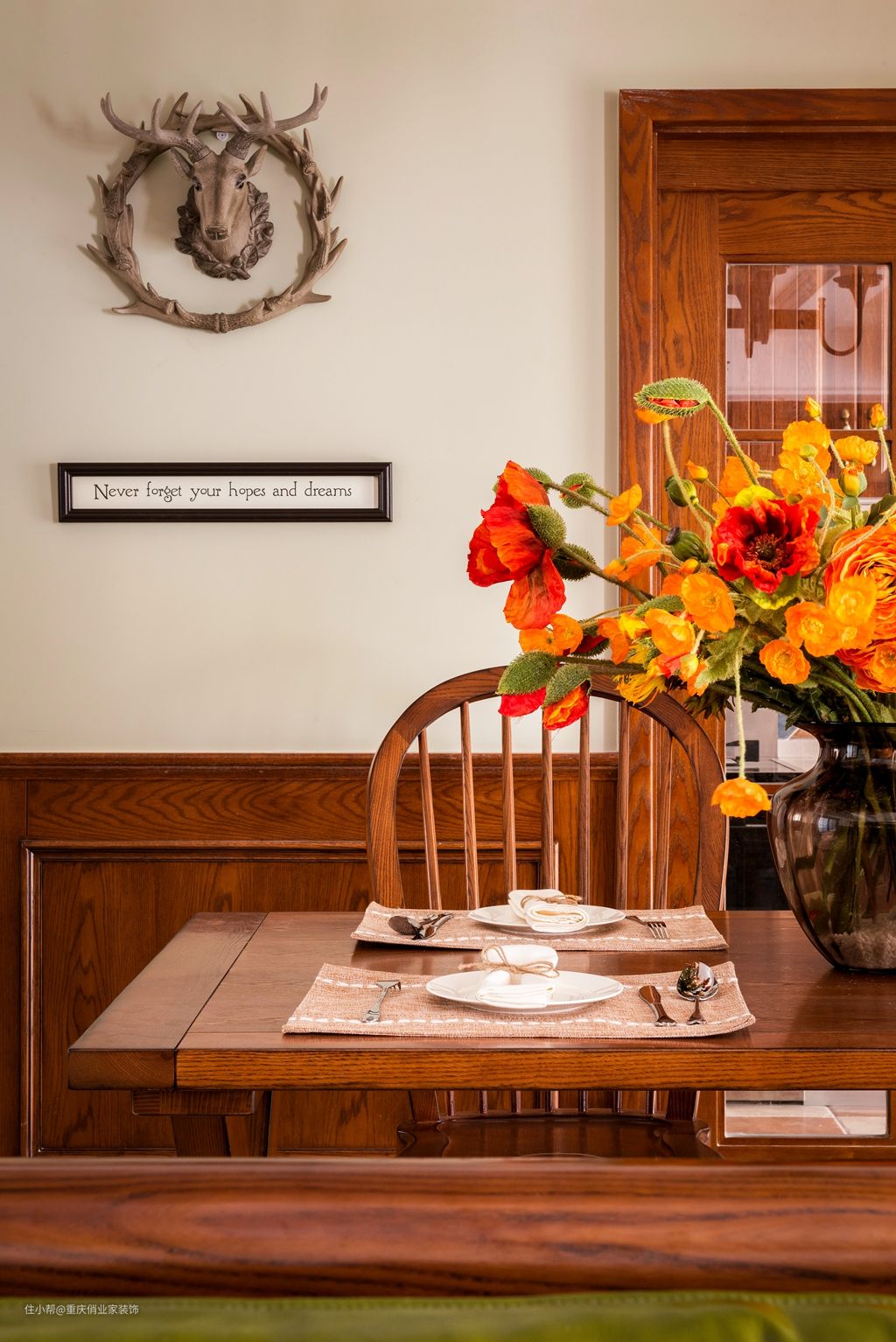 蜜蜡色方桌搭配上一束热烈艳丽的鲜花,为美式风格的家庭空间打造一份浪漫、惬意的情调。