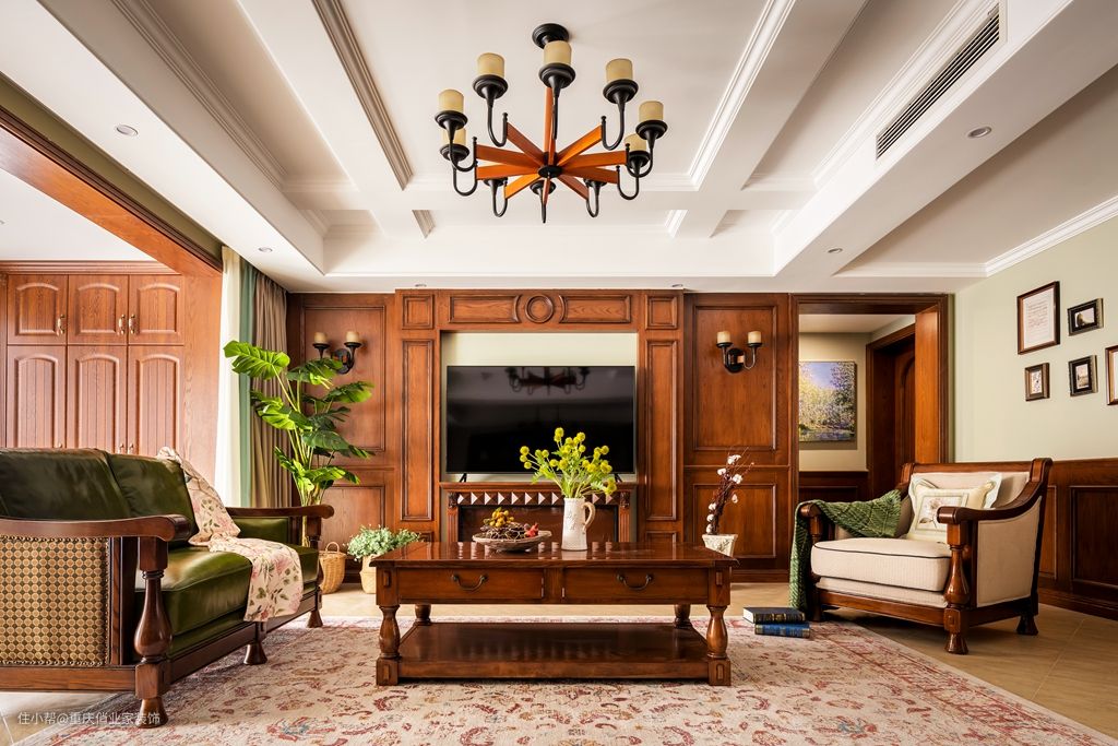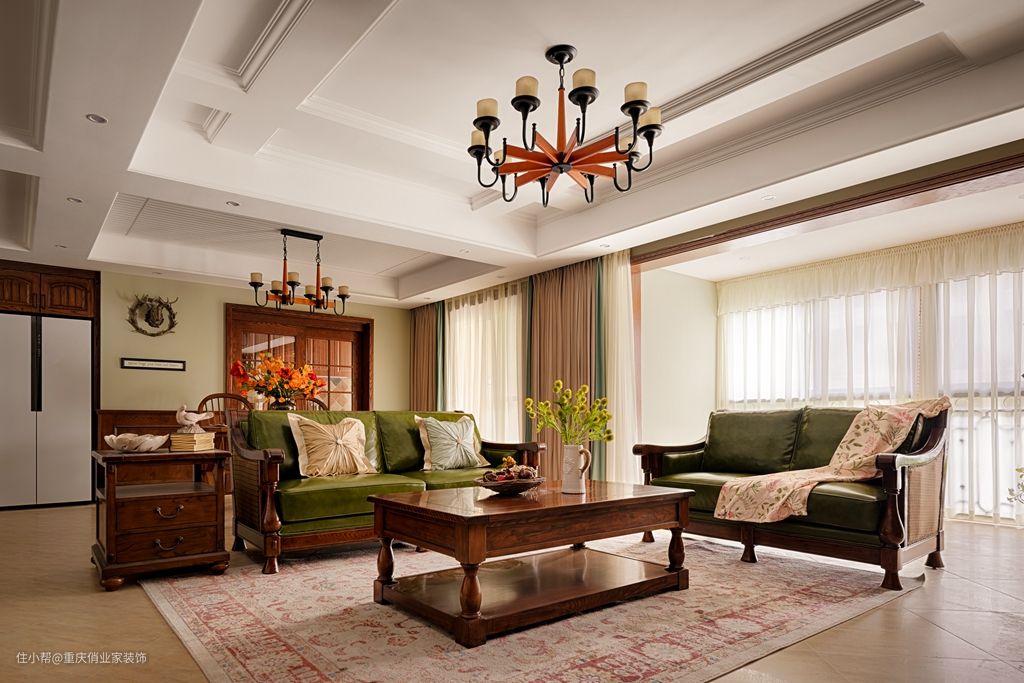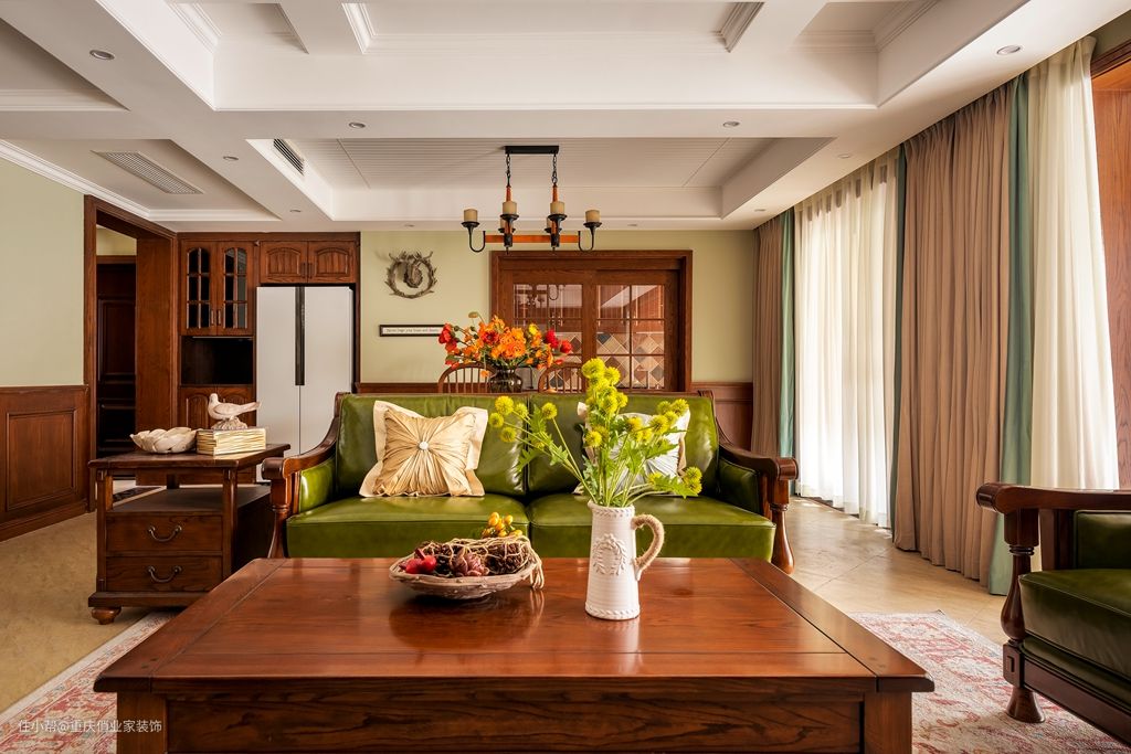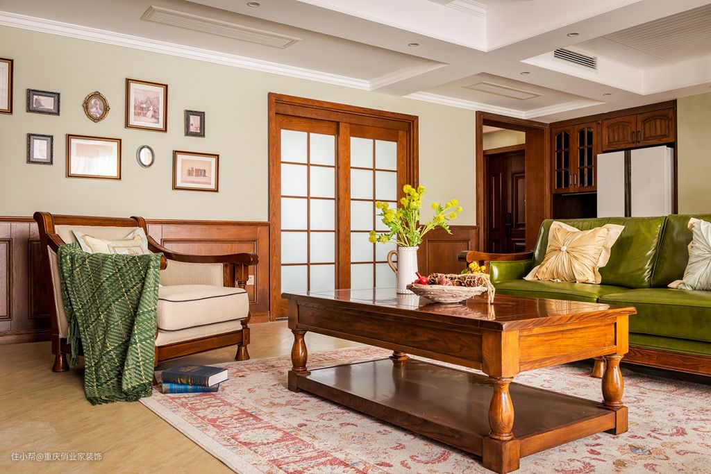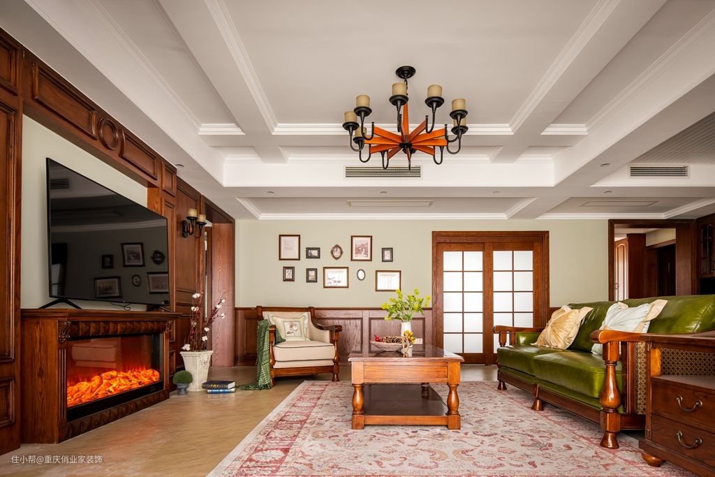 蜂蜜色护墙造型让整个空间更具美式的大气感,复古绿的皮质沙发是业主的心头好,精致时尚。