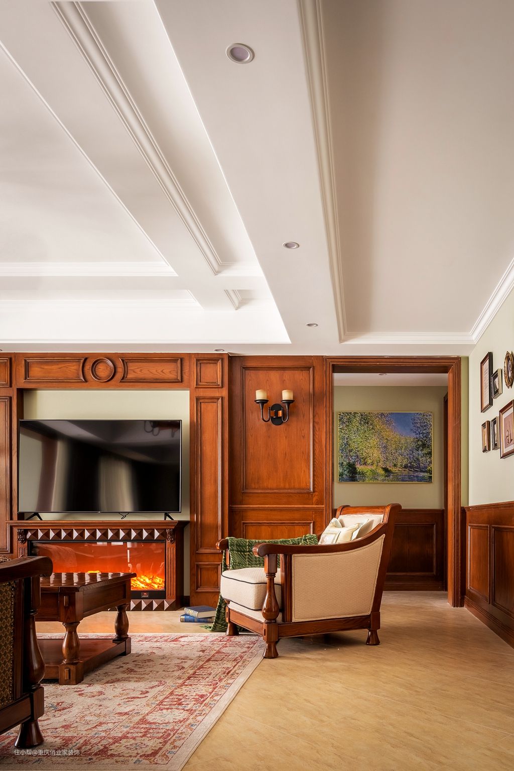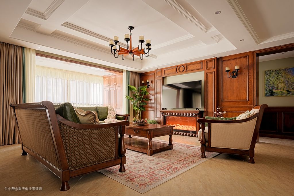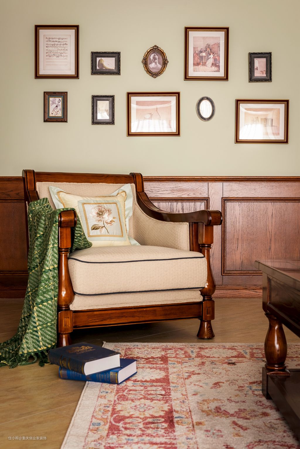 蜂蜜色护墙造型让整个空间更具美式的大气感,复古绿的皮质沙发是业主的心头好,精致时尚。