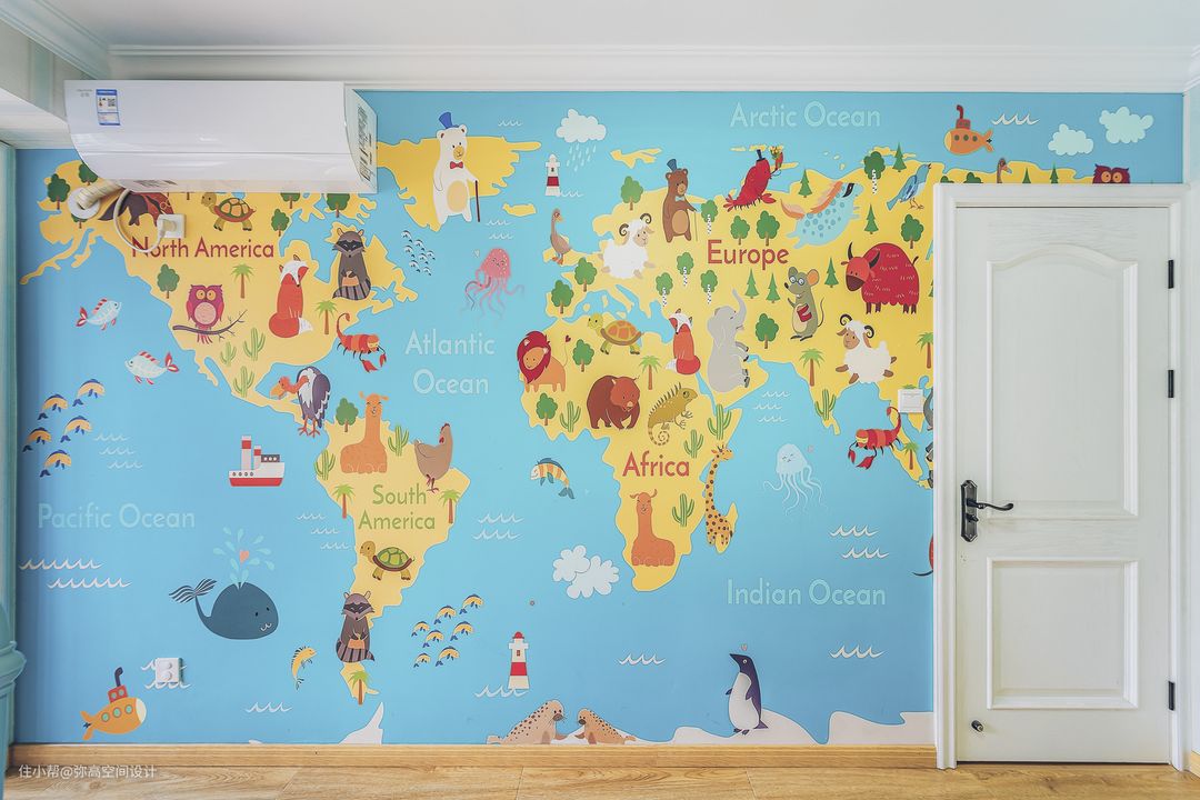 墙面贴了地图墙纸,小朋友很喜欢。床是定做的榻榻米,我们定制了铁艺床头靠。柜子和桌面都用了蓝色系。