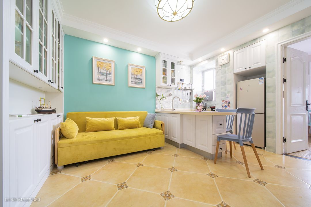 客厅的布局从左往右依次是:书柜→沙发床→餐桌操作台→灶台区。将餐桌和水池操作台形成整体,极大程度的节约了空间。配色上墙面刷了蓝绿色的乳胶漆颜色,与黄色沙发形成对比,使得空间富有生命力!