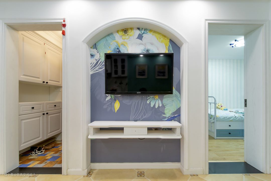 电视背景墙这原来是卫生间的门,我们调整了一下门的位置,自然形成了一个背景墙,做了个拱形的造型,配合整体风格,两边的门洞刚好有对称效果。→请忽略这故意挂高的电视和电视柜吧