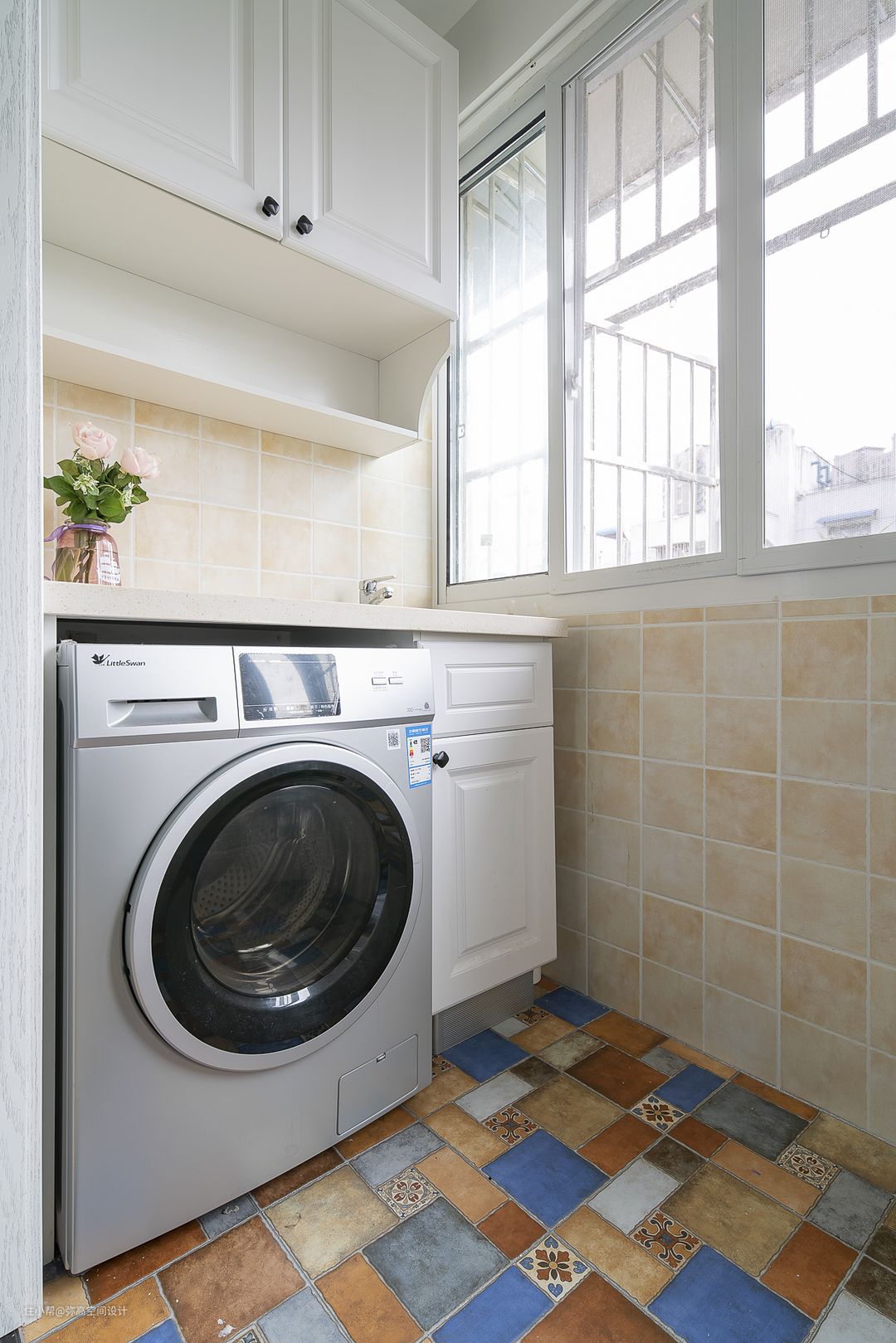 阳台比较小,连接男孩房,色彩上丰富些,洗衣机吊柜做了一格方便摆放物品的空间