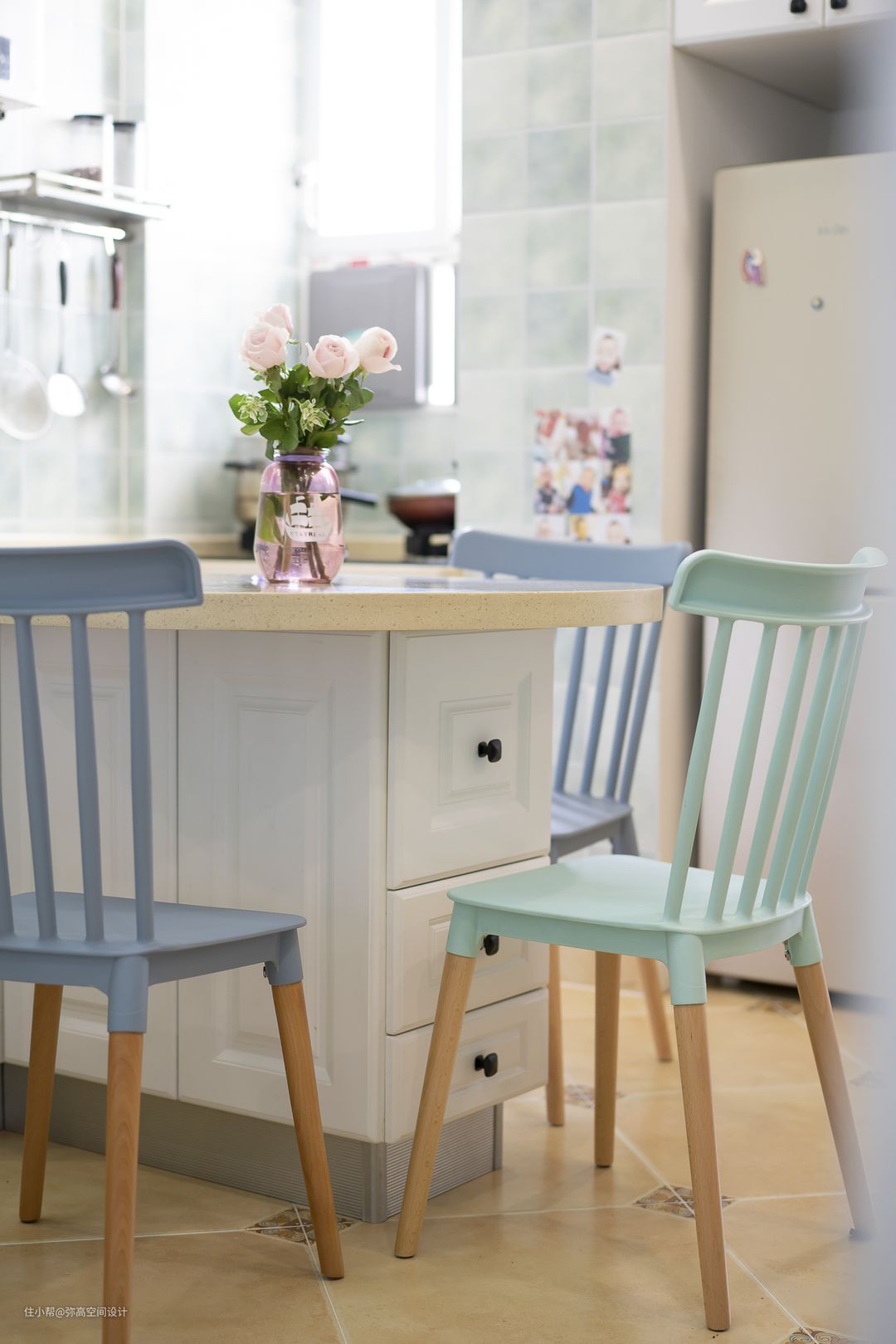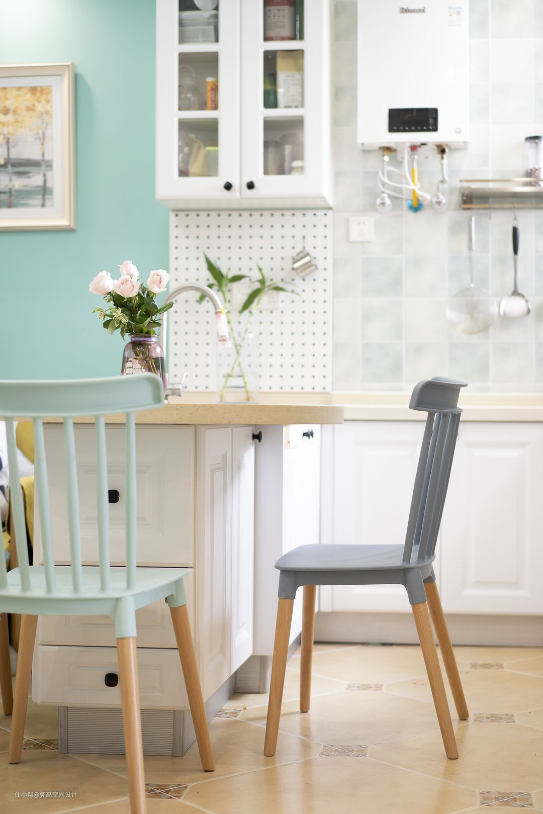 很喜欢这个角度,看着很舒服,蓝色的椅子与背景相呼应。想说一下厨房与餐厅的过渡,瓷砖贴完有收口的问题,我们定制了一块洞洞板,可以挂一些用具,方便实用!