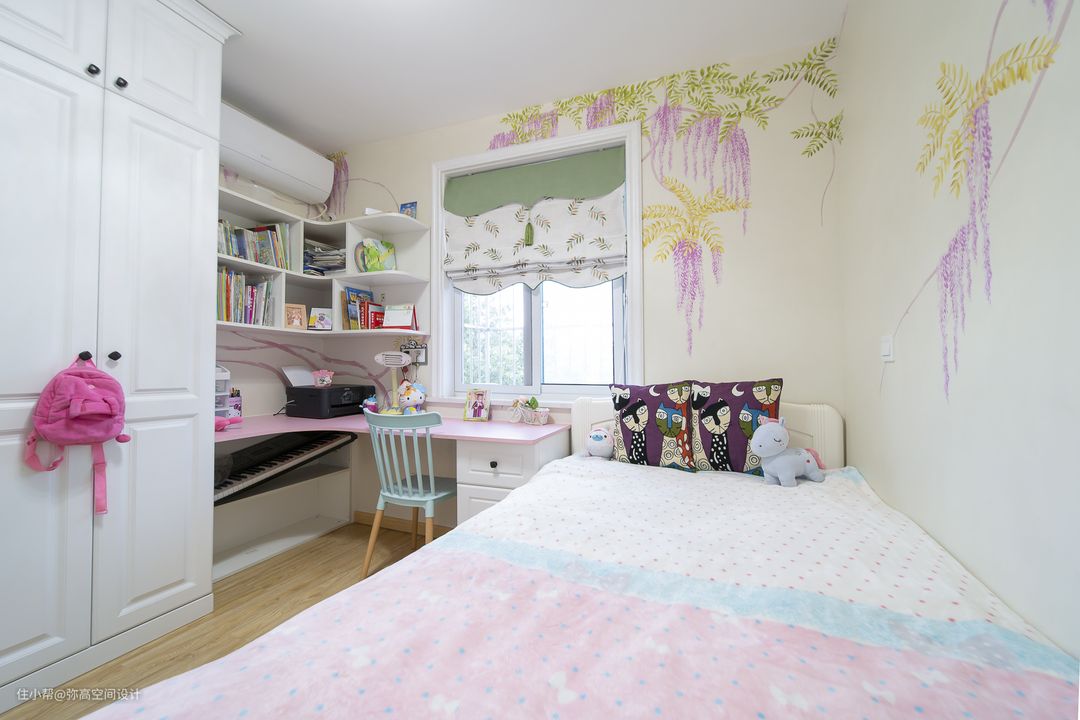 女孩房是原来的厨房改的,空间相对大一些。房间色调没有用大面积粉色,墙面墙纸用了米黄色底色紫藤萝图案,可以用很长时间,书桌做了转角,桌面用了粉色,满足刚上一年级的姐姐的喜好。