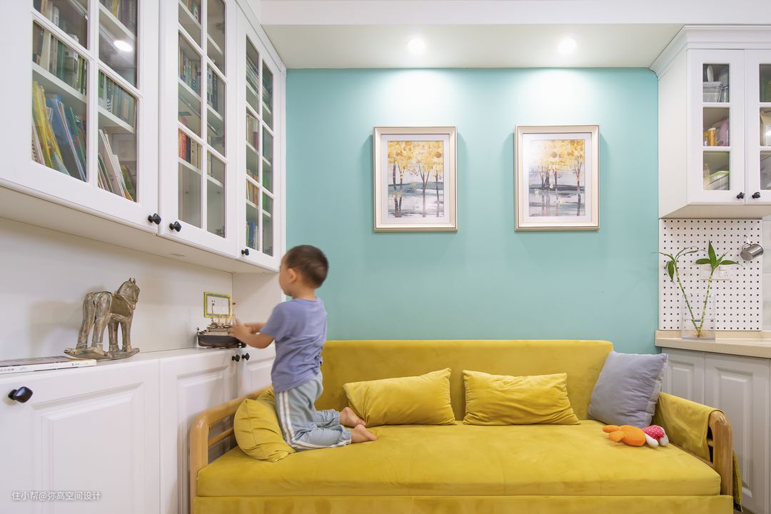 客厅的布局从左往右依次是:书柜→沙发床→餐桌操作台→灶台区。将餐桌和水池操作台形成整体,极大程度的节约了空间。配色上墙面刷了蓝绿色的乳胶漆颜色,与黄色沙发形成对比,使得空间富有生命力!