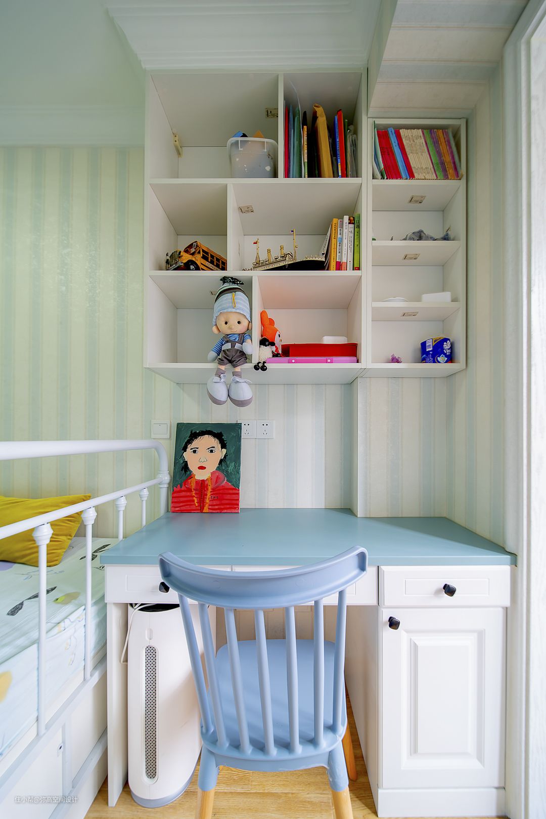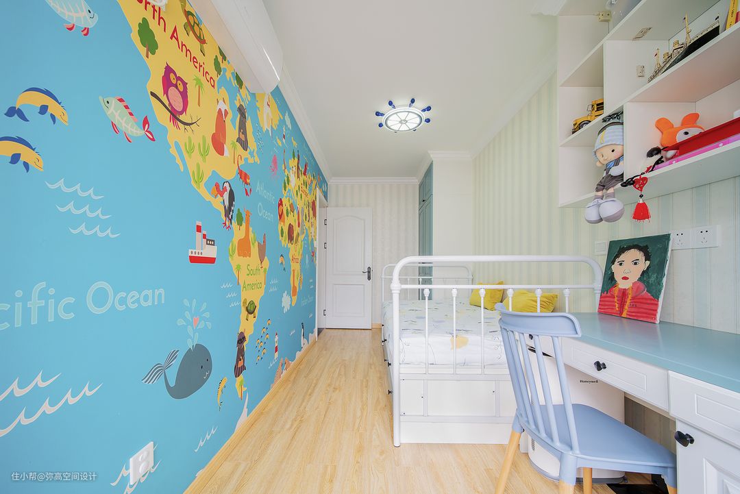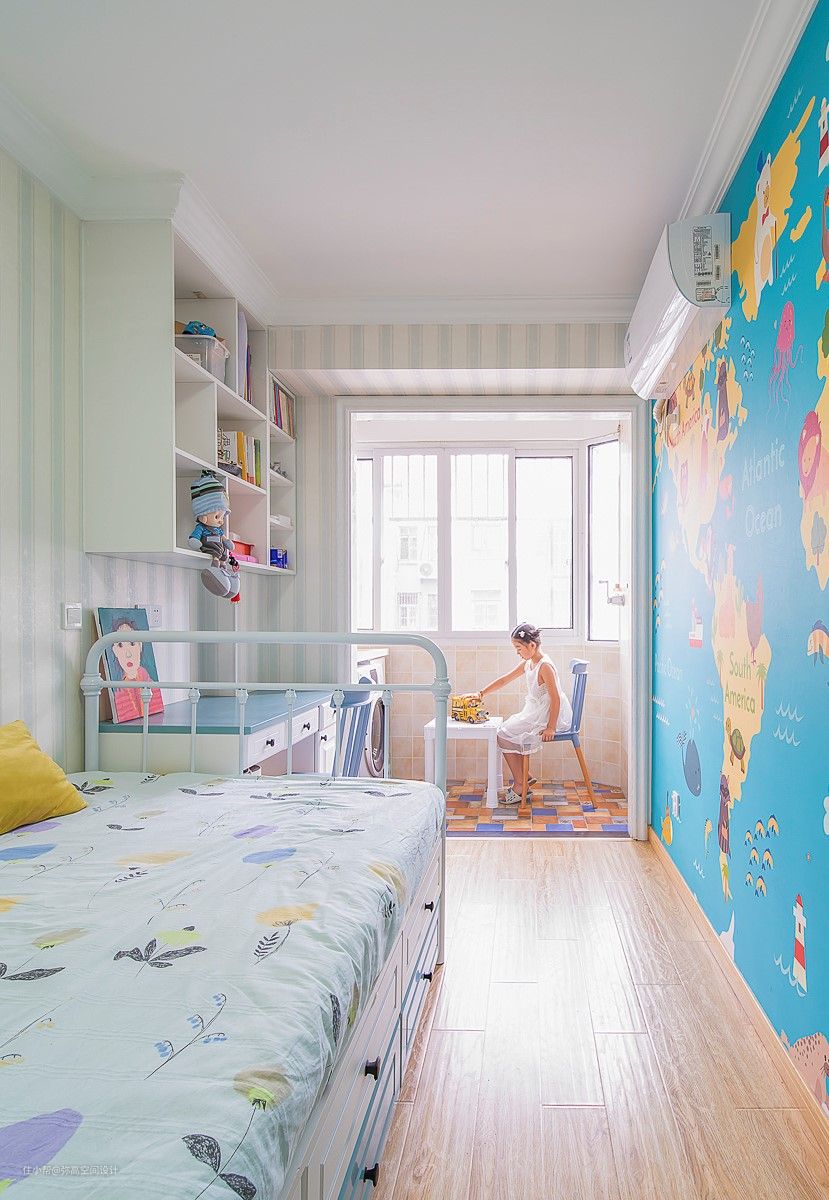 墙面贴了地图墙纸,小朋友很喜欢。床是定做的榻榻米,我们定制了铁艺床头靠。柜子和桌面都用了蓝色系。