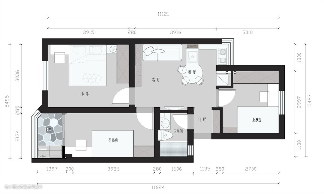 我爱我的家 儿子女儿我的他 爱就是感谢 不记任何代价 我爱我的家 儿子女儿我亲爱的她 爱就是珍惜 时光和年华…… 我们的业主一家就是歌曲里这样的一家四口,在装修的时候,妈妈为了两个孩子能有更好的成长空间,在儿童房的设计上考虑了很多,还自己画了很多手稿,总之特别用心,父母之爱子,则为之计深远! 房子是应天高架下面的一处老房子,房子内部墙体几乎都是承重墙,改动空间不大,为了满足业主三室两厅一厨一卫的要求,我们进行了如下调整。