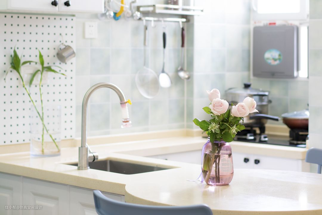 很喜欢这个角度,看着很舒服,蓝色的椅子与背景相呼应。想说一下厨房与餐厅的过渡,瓷砖贴完有收口的问题,我们定制了一块洞洞板,可以挂一些用具,方便实用!