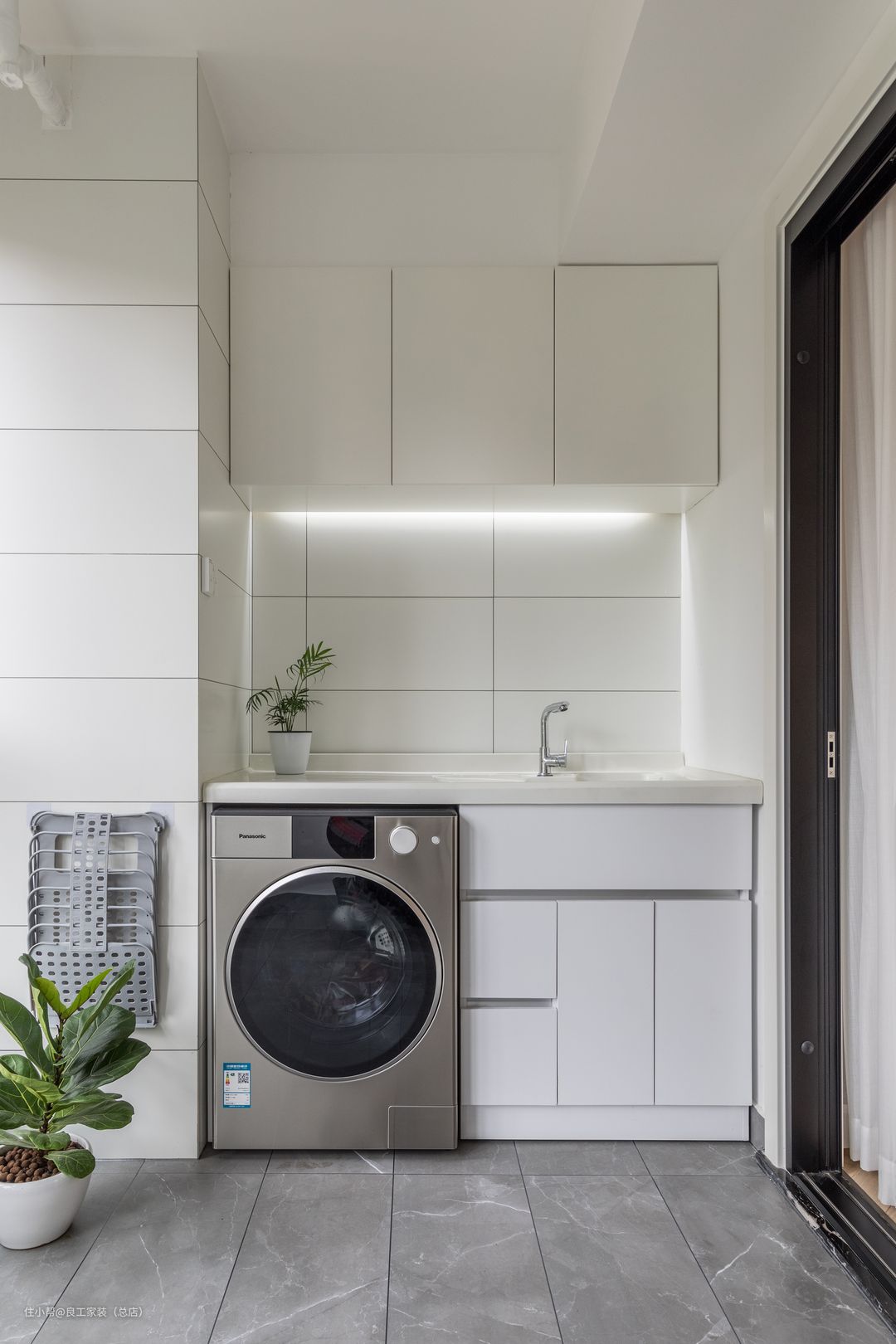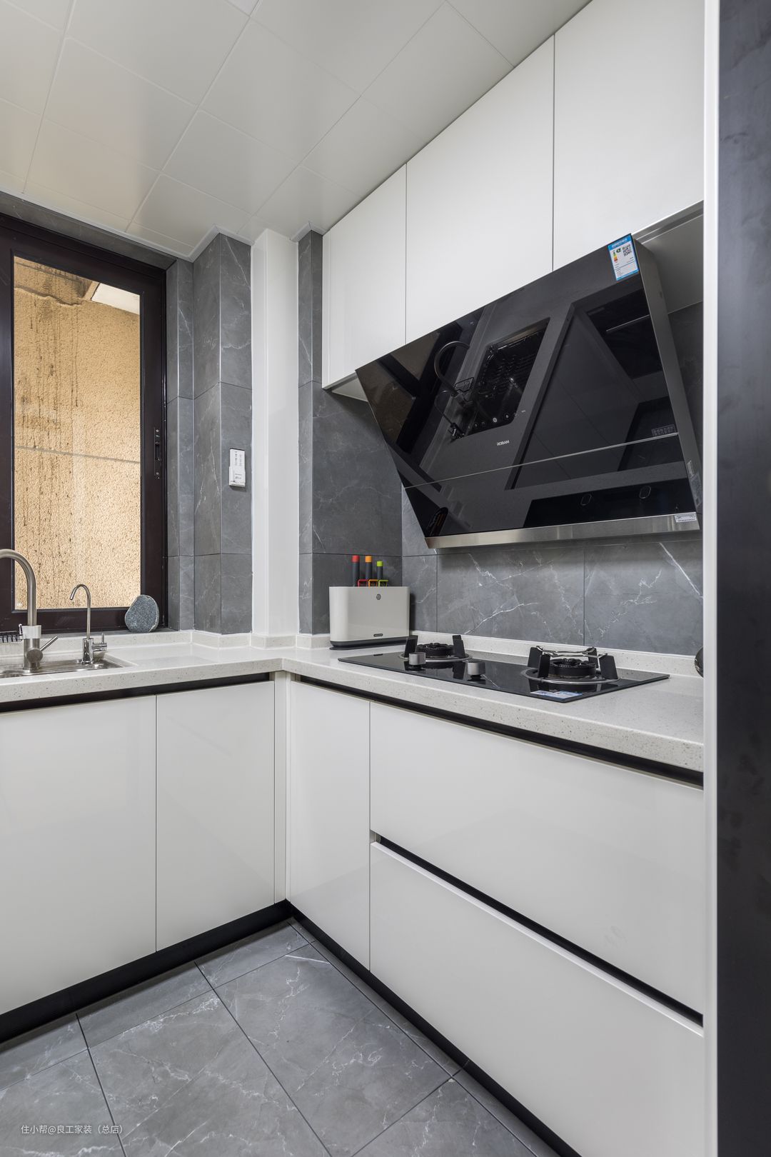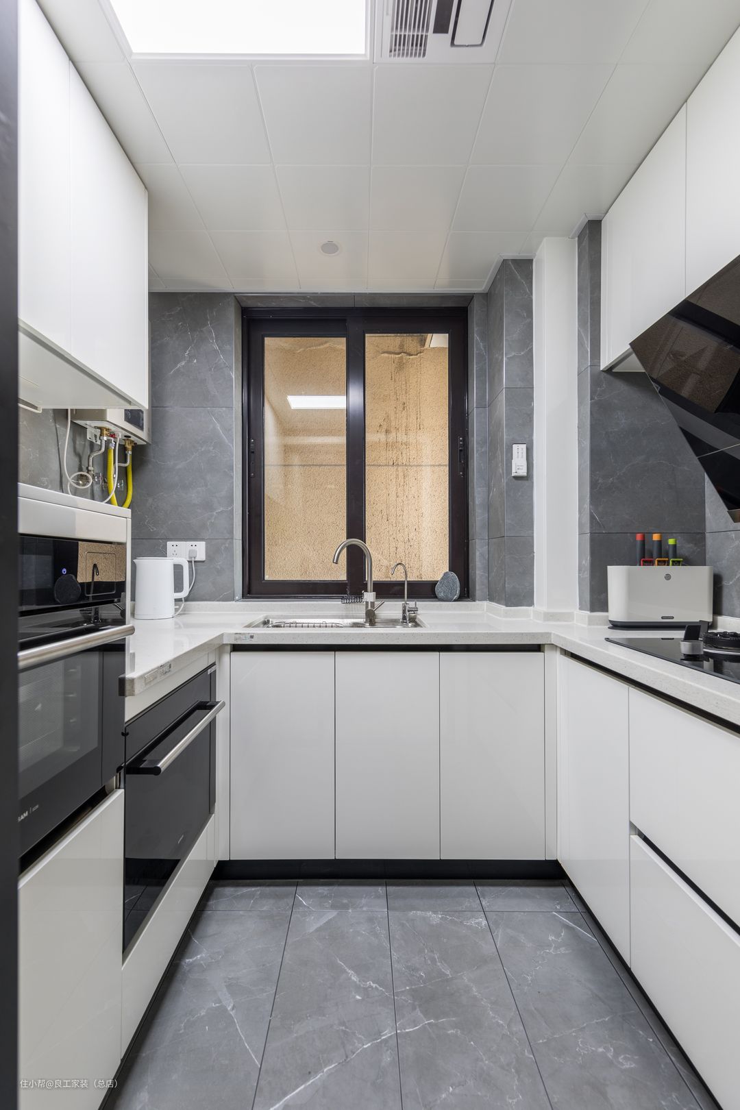 厨房空间打造成了黑白色调,白色的烤漆柜体与磨砂质感的台面完美契合,搭配深灰色花纹墙砖,时尚大气。左侧定制了高柜,上下用于储物中间可蒸可烤。