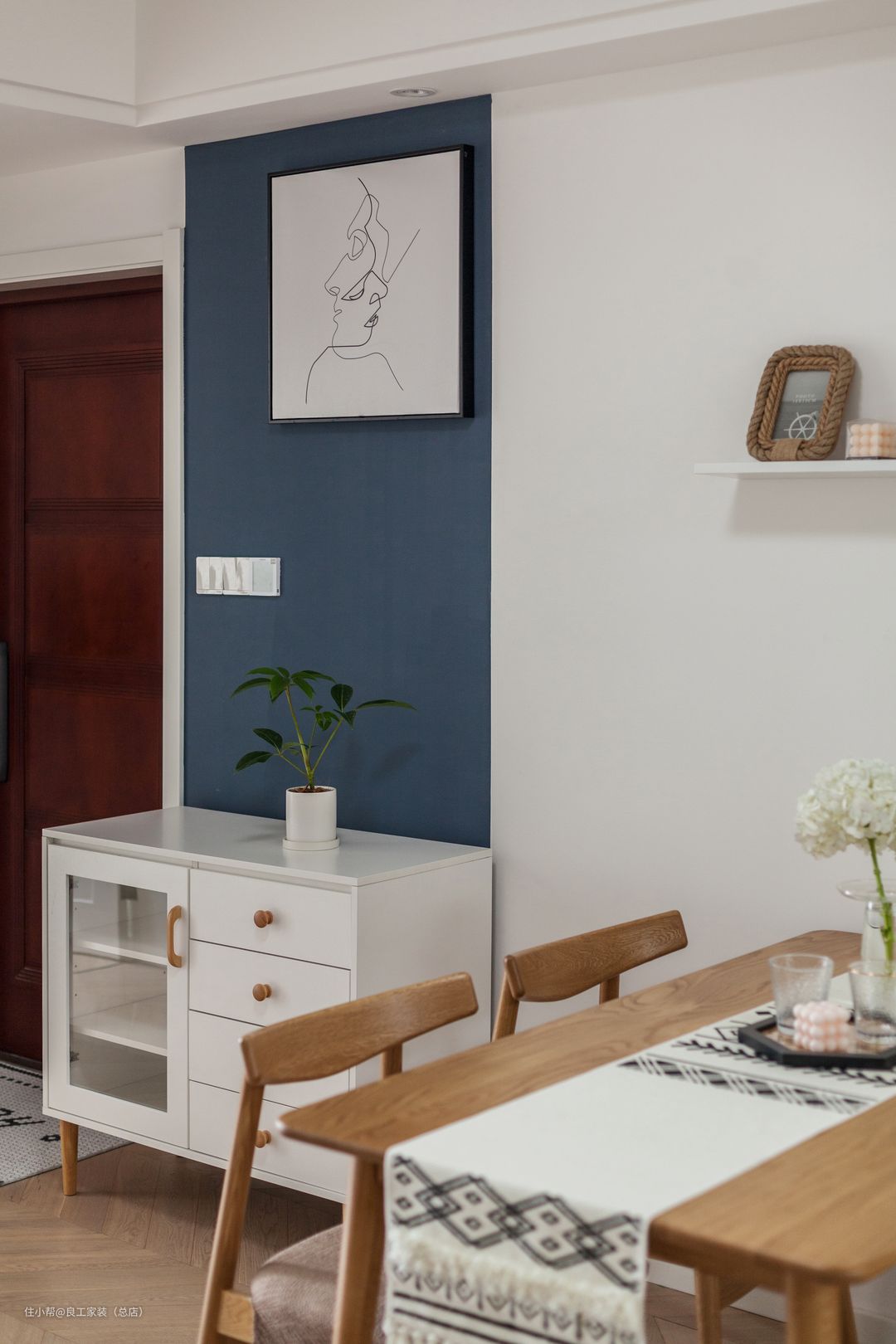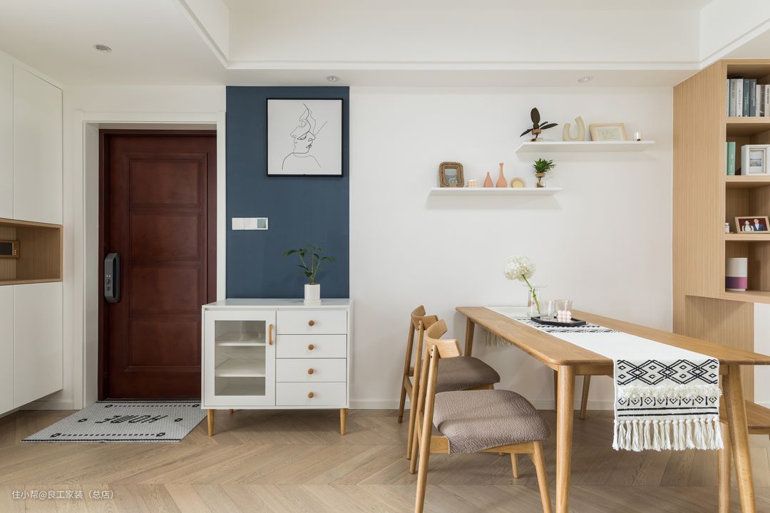 餐厅的收纳空间给人以精巧细腻感,有序错落的隔板让装饰物得到了漂亮的展示;白色的小餐边柜精致小巧,与别致的静谧蓝墙搭配出艺术感十足的效果,可谓点睛之笔。
