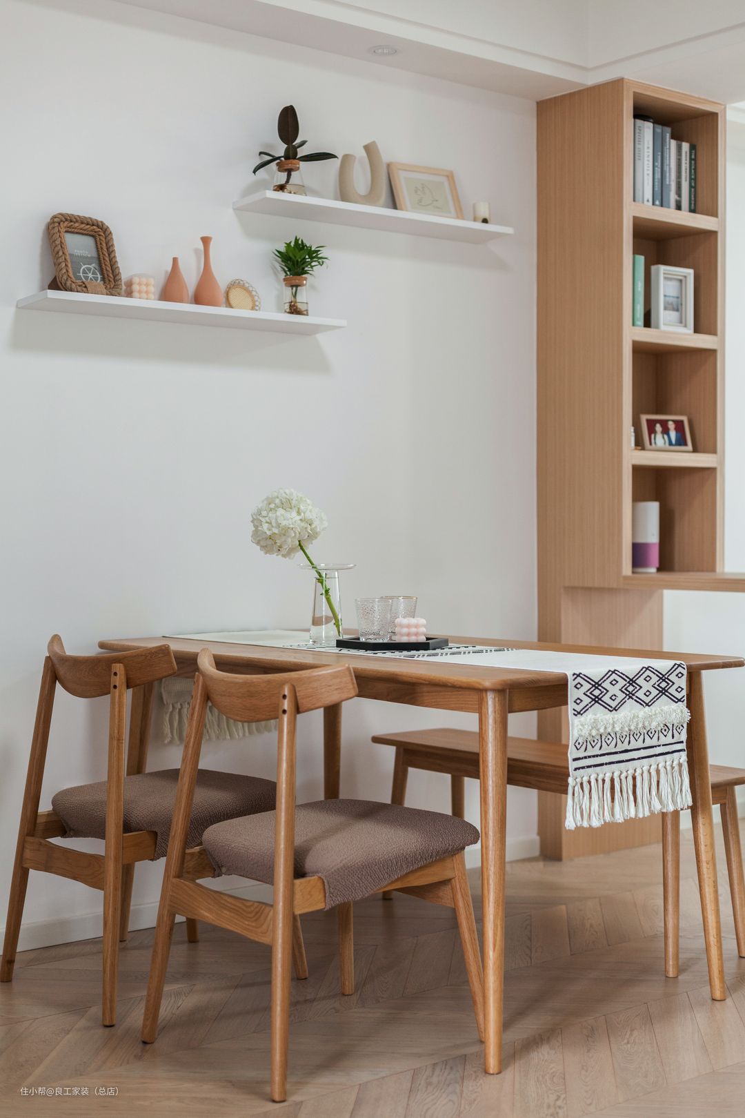 自然的木纹、温润的触感、柔和的光泽,原木质感的朴素无华在这个简洁的空间里最适合不过了,顺应季节更换餐垫和花束,让餐厅空间的新意不受限。