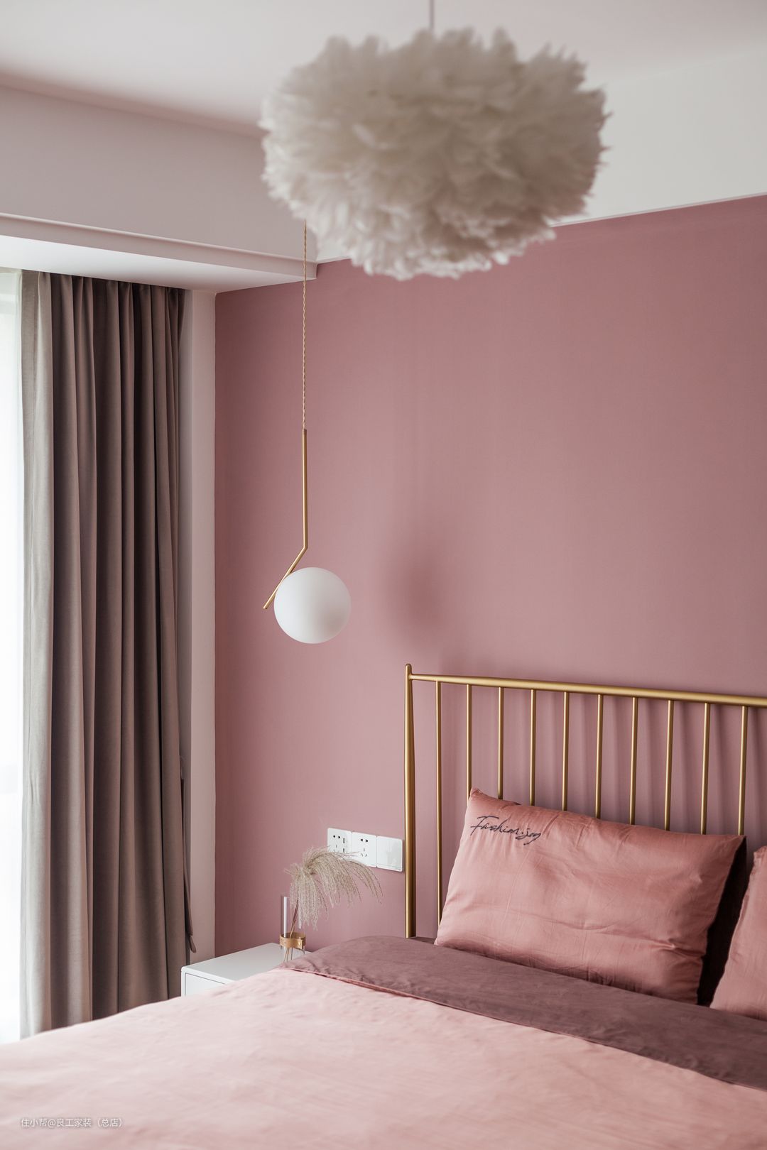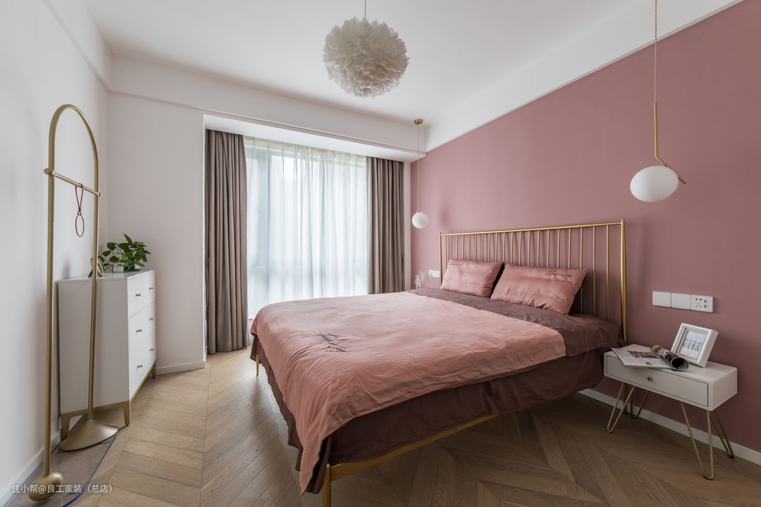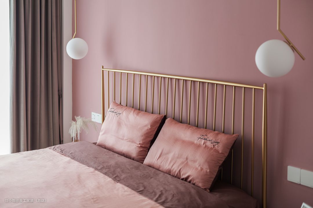 色彩会给空间带来沉浸式的体验,就如这个主卧,床头背景墙的这一抹粉色,浪漫指数即刻飙升,配上金色铁艺床,高级轻奢感UP。金属、皮草、花瓣元素的细节点缀,将北欧风精致、浪漫与温柔的一面尽情释放出来。