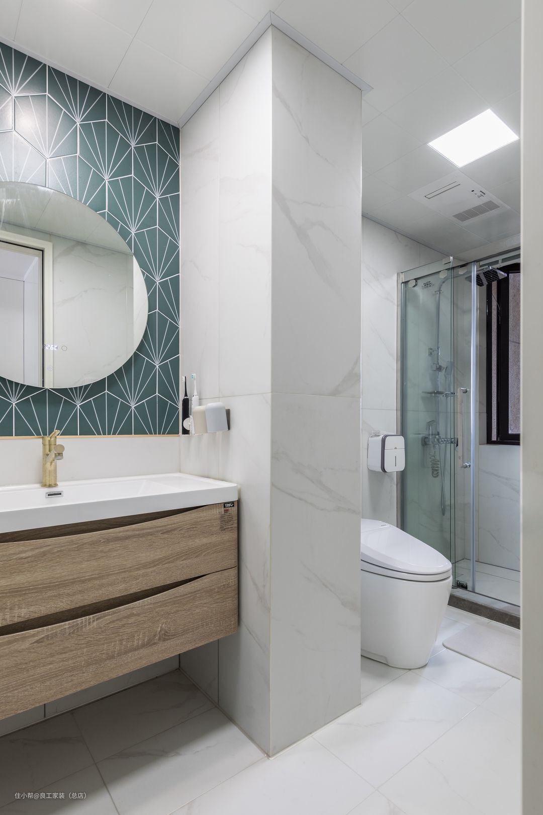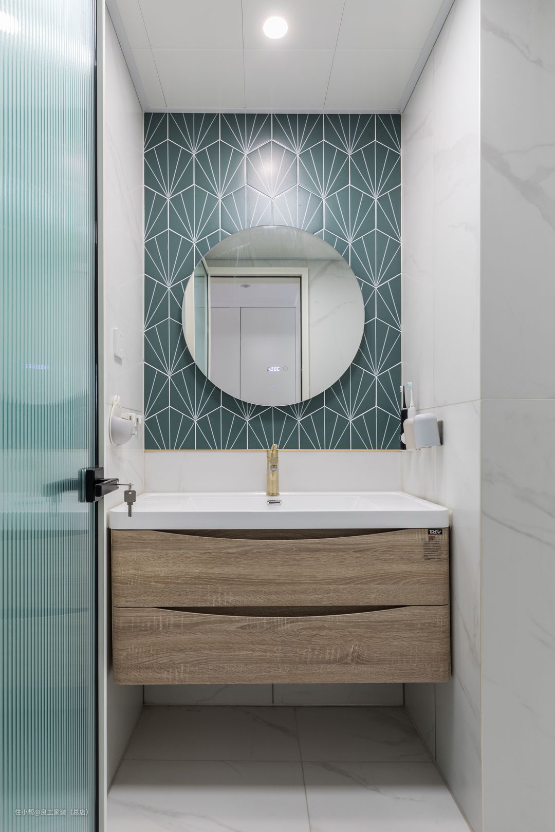 原木色柜体搭配青绿色瓷砖,让次卫充满清雅舒缓的气息。