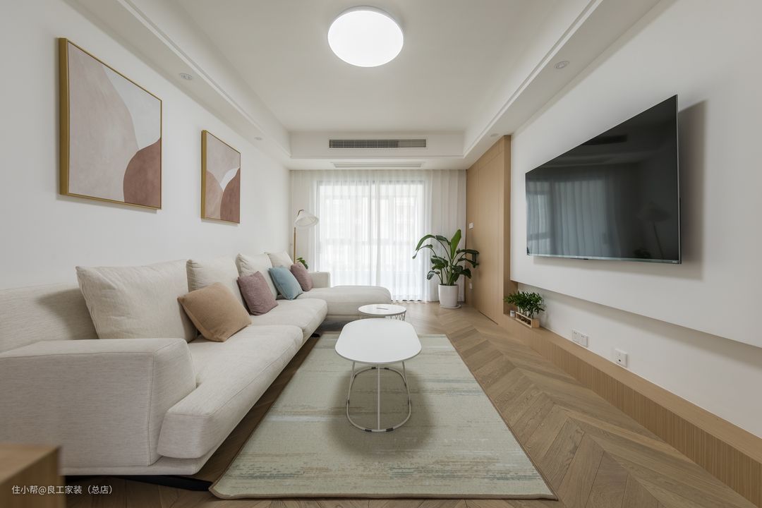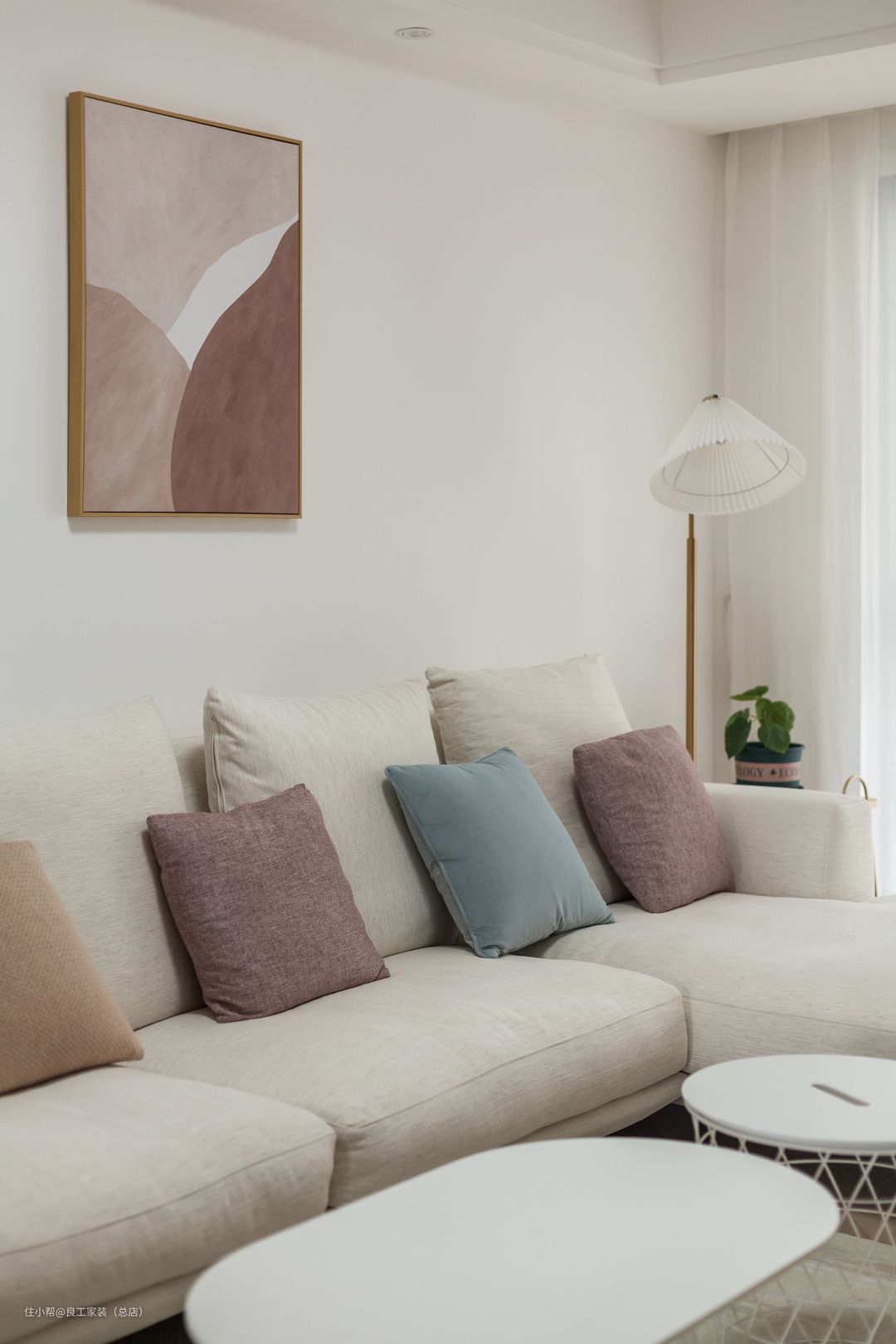 米白色系的转角沙发以简单的方式诠释了家的温柔,莫兰迪色系的靠包与墙画,成为了平衡客厅空间色彩的点缀,温和而宁静。