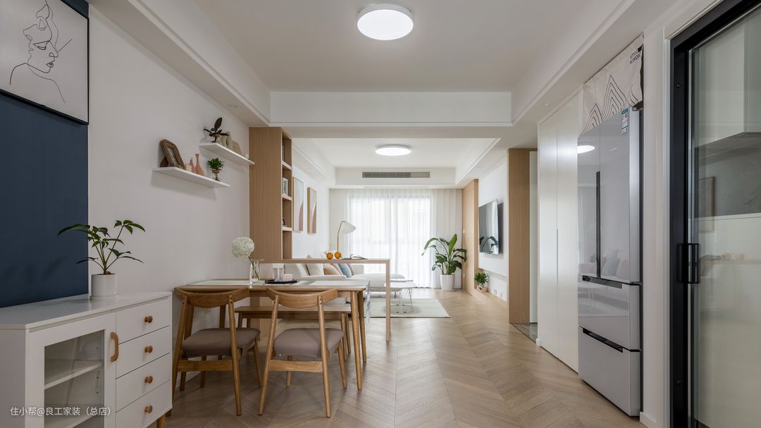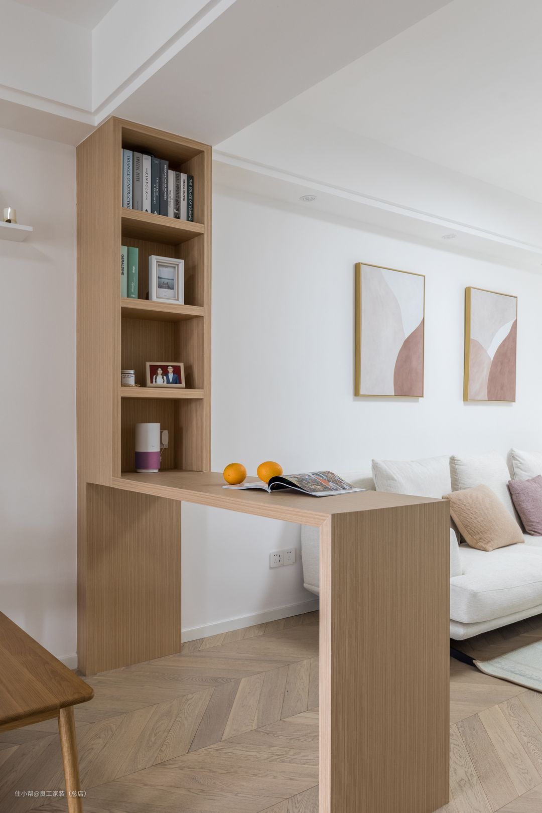 会客区域与餐厅区域用极简风格的原木定制条形长桌巧妙隔断,靠墙垂直向上还做了一排精巧书柜,一个小型阅读区应运而生。对设计师而言,让一座冰冷的房子成为有温度的家,就在这方寸的尝试和进退之间。