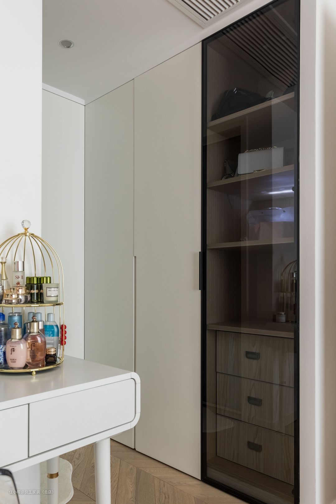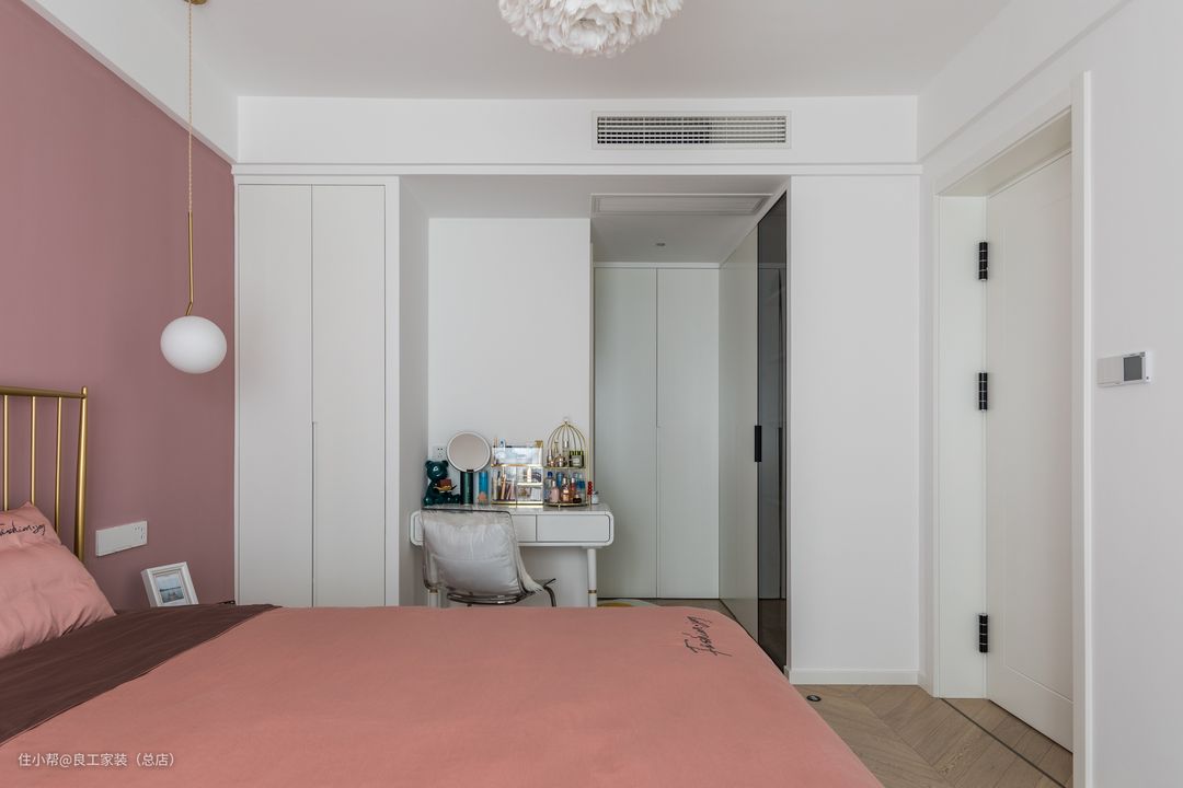 考虑到女业主对卧室收纳的需求比较大,所以三面墙都做了储物衣柜,床一侧的墙面还腾出一个梳妆台。