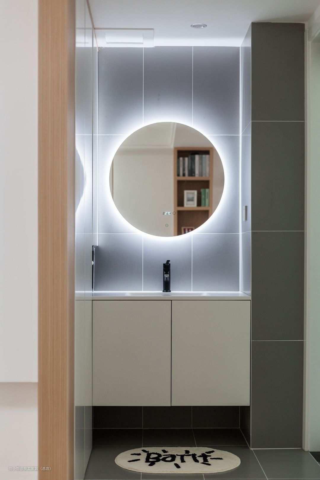 主卫采用了磨砂玻璃移门,使空间显得更通透。“自带光环”的圆形镜像天空中的一轮满月,在灰色系墙砖映衬下,明亮又不失温馨浪漫。