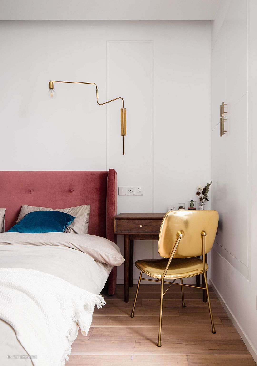 次卧室利用层次渐进的蓝色“窗帘、床品、被单”做了大面积的点缀,整体基调偏性冷淡, 但床边金属材质的置物架,以跳脱的色彩打破了静谧略显沉闷的空间氛围, 给人极强的视觉冲击,丰富了卧室小空间的层次感!