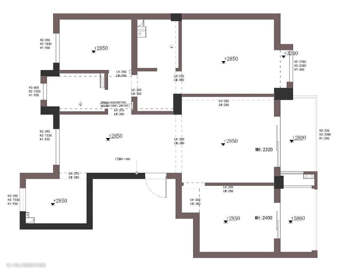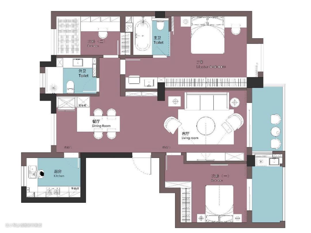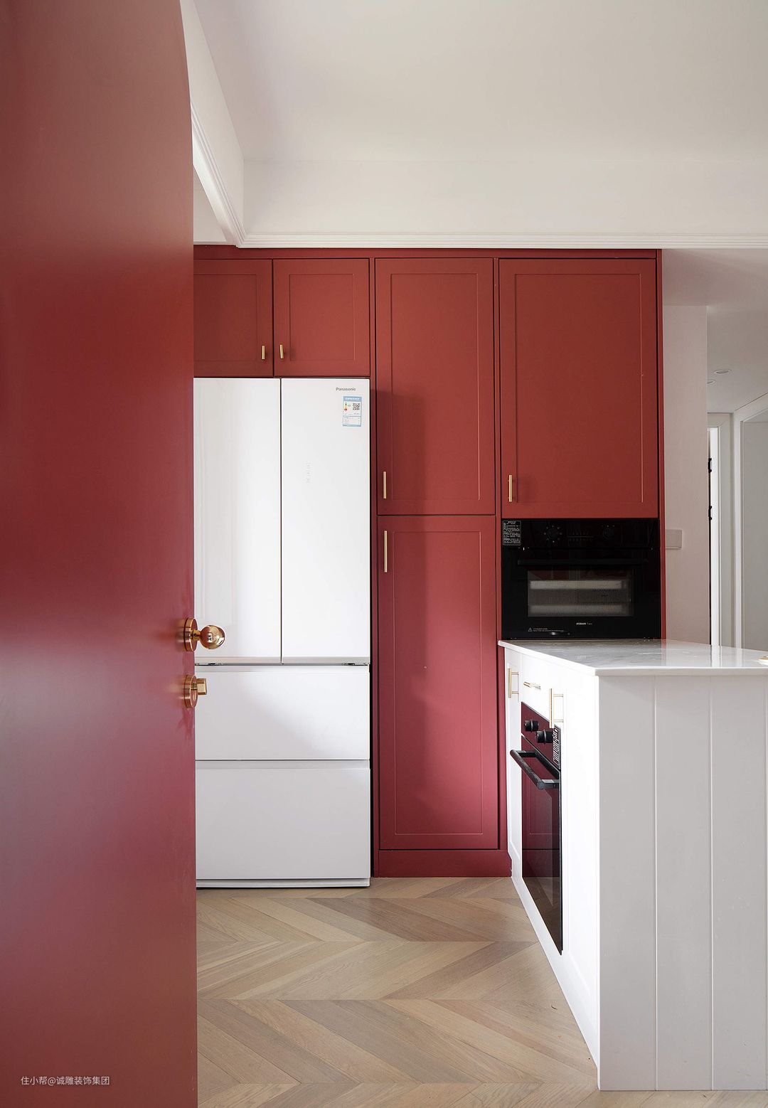 原户型通透方正,动线流畅。 三房朝阳,通风采光都好,因此结构并无过多改动 原厨房空间较小且无法外通, 冰箱需要向餐厅借位。 主卧墙体整体下移, 既满足了储物需求,同时也让空间更整体