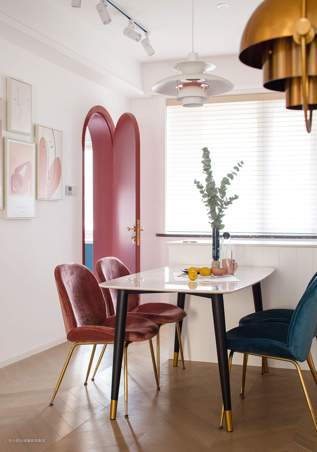 餐厅就在客厅的旁边,开放式的布局, 大理石桌面的餐桌紧靠吧台, 还有红色和蓝色结合的舒适座椅,简约时尚