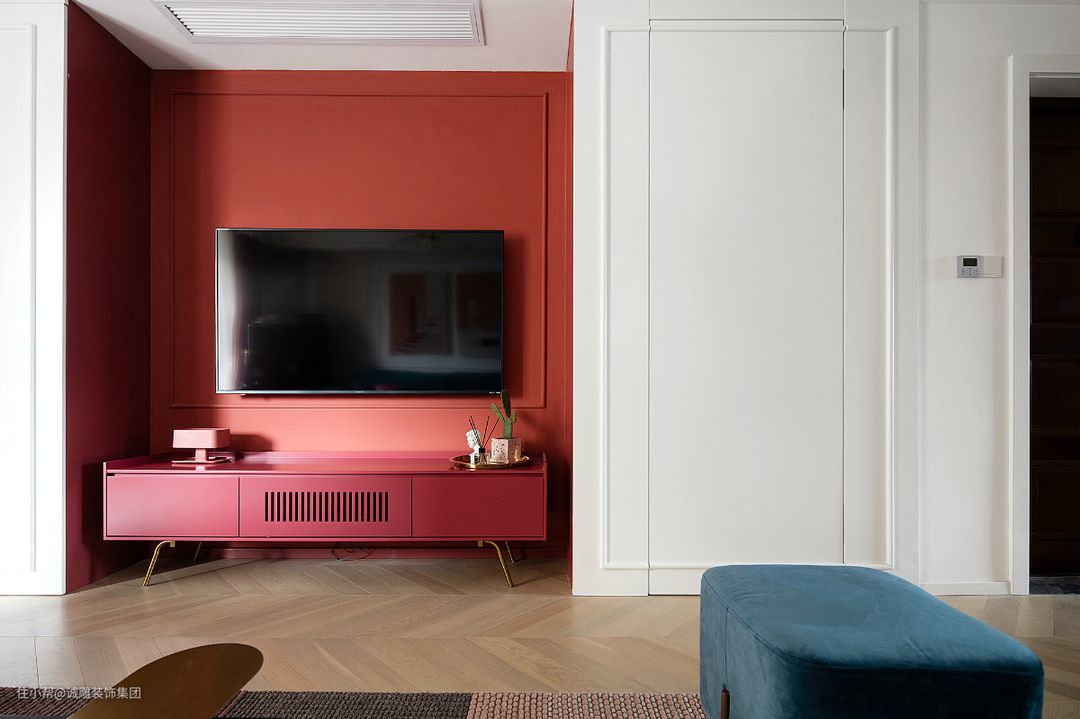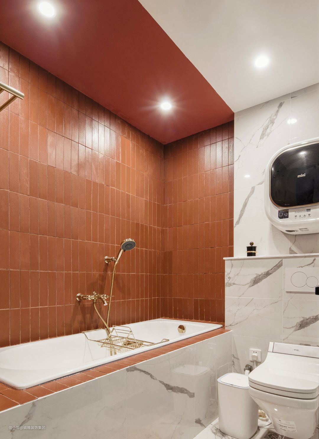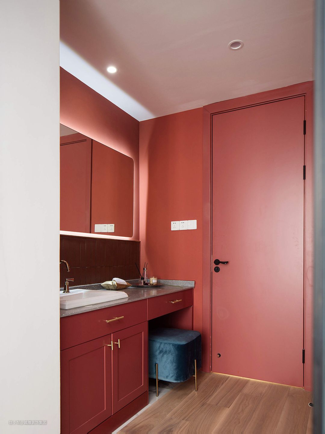 主卫在红色背景之中点缀蓝色家居, 当冷与暖相互碰撞,典雅奢美的气韵迎面而来