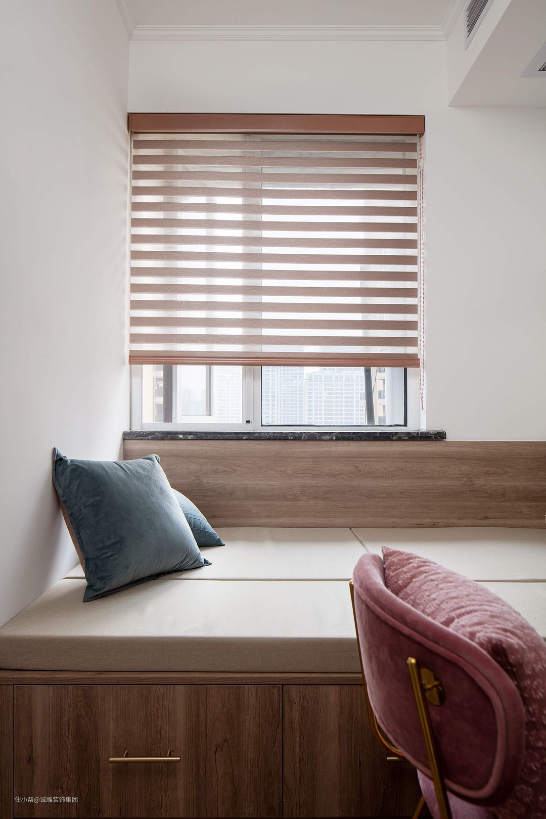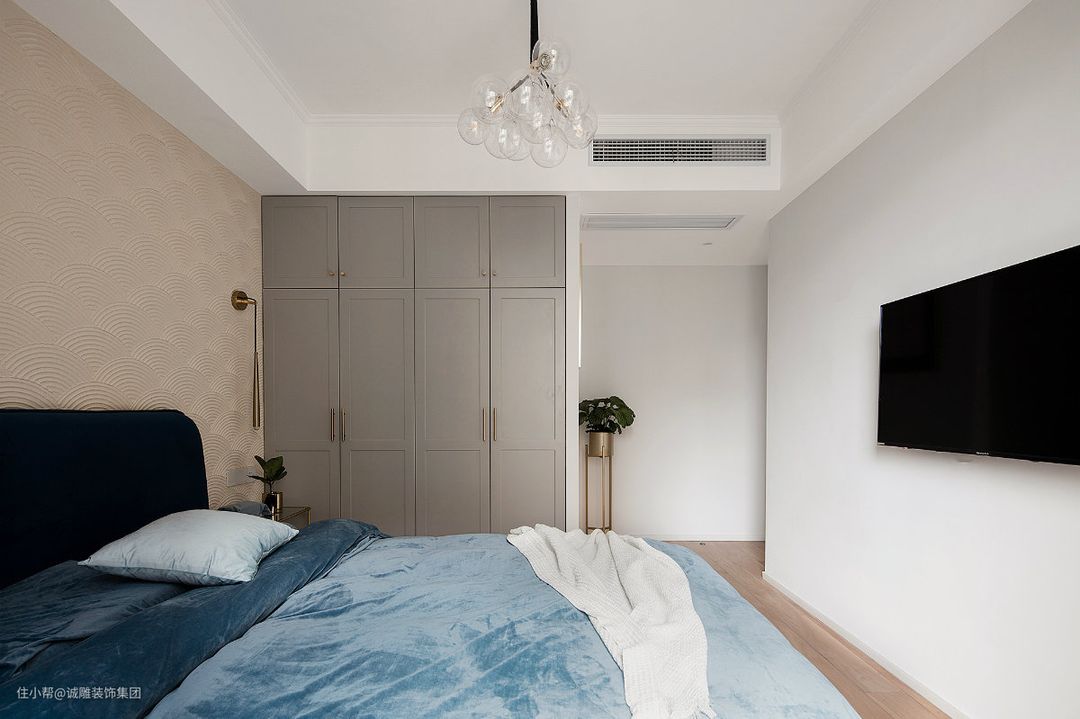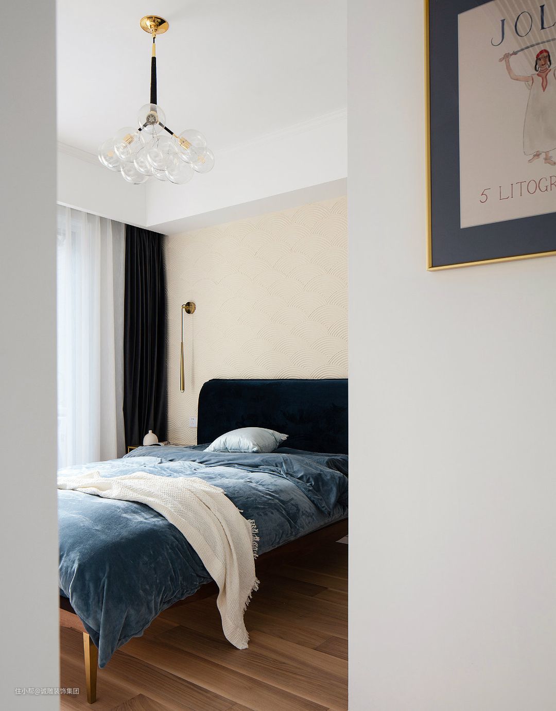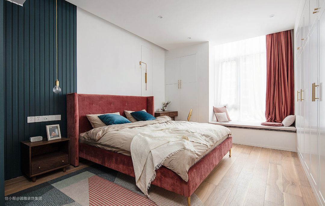 主卧,延续温柔轻奢风,以蓝红白作空间主色调, 打造浪漫一角,背景墙局部采用墨蓝色系, 通过米褐色与金属元素点缀。