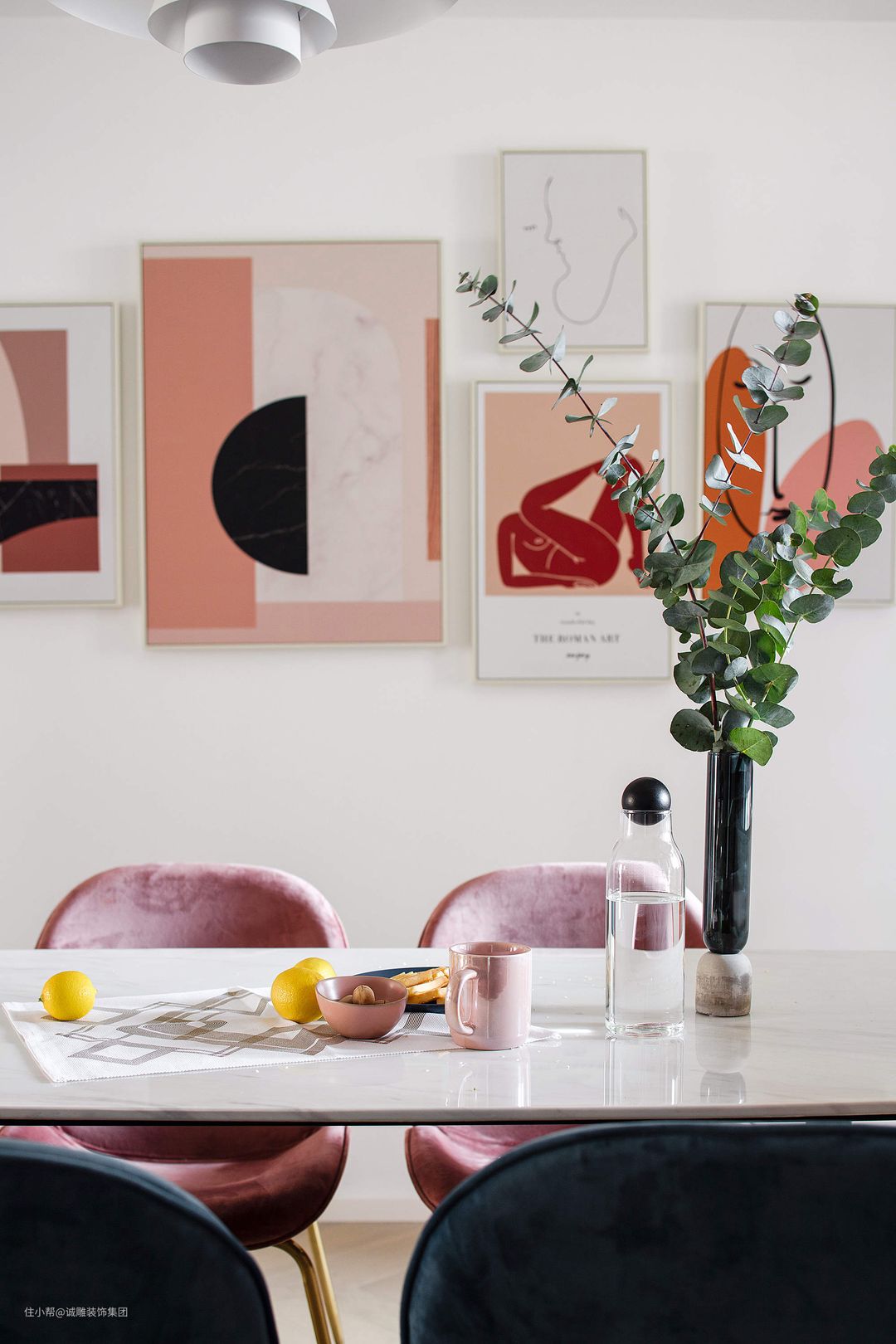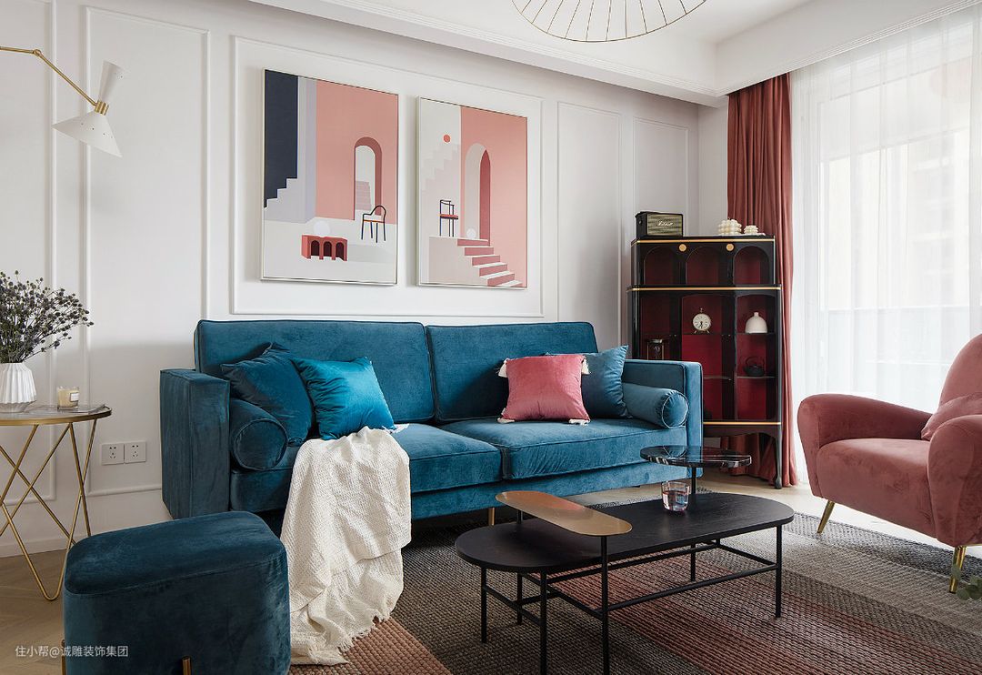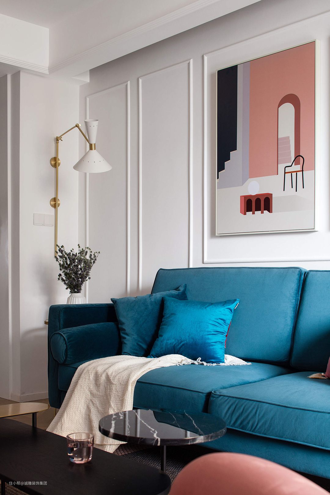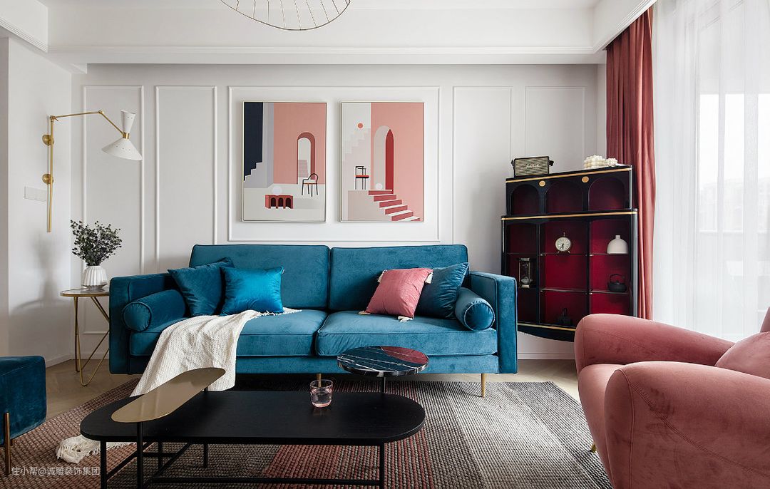 客厅里沙发背景墙是简单的白色,但是添加了白色的石膏线,挂上几幅充满艺术气息的挂画装饰,显得精致又文艺。 搭配蓝色的天鹅绒沙发,还有金属和大理石结合在一起的茶几,时尚又带有冷淡的感觉。